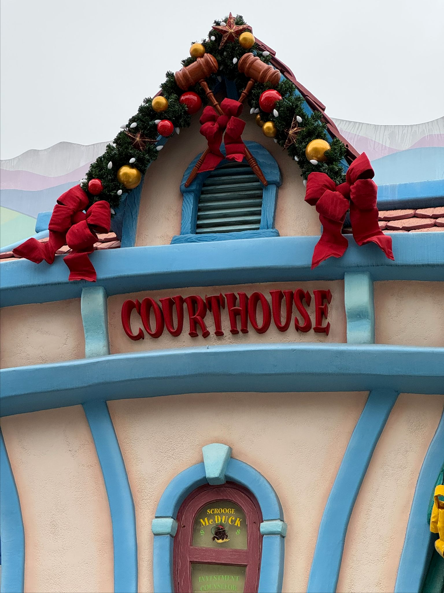 - Each building has ornaments representing their respective theme, including giant bills at the bank, giant peppermints at the dentist, and nautical designs on Donald’s Boat.