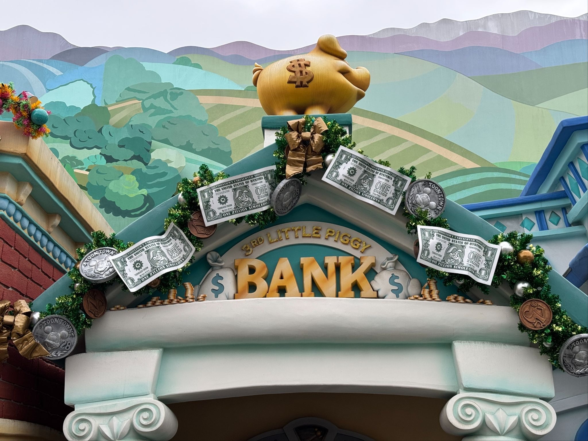 - Each building has ornaments representing their respective theme, including giant bills at the bank, giant peppermints at the dentist, and nautical designs on Donald’s Boat.