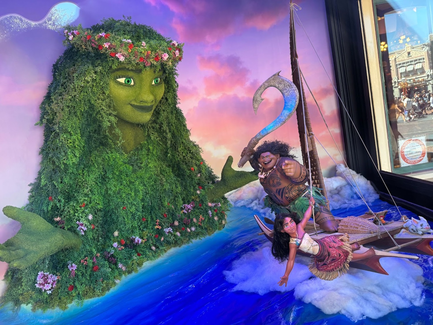 - Replacing the Zootopia-themed display that debuted alongside the 70th anniversary celebration, the new display features Moana, Maui, Te Fiti, Pua, Hei Hei, and some hidden Kakamora as they appear in the hit sequel Moana 2.