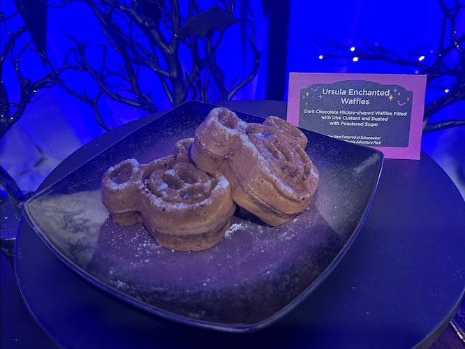 - Ursula Enchanted Waffles: Dark chocolate Mickey-shaped waffles filled with ube custard and dusted with powdered sugar (New)