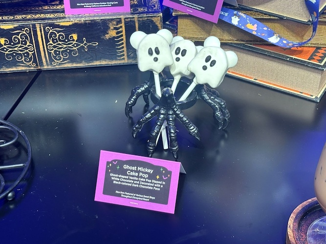 - Ghost Mickey Cake Pop – Ghost-shaped Vanilla Cake Pop Dipped in White Chocolate and Decorated with a Black-colored Dark Chocolate Face