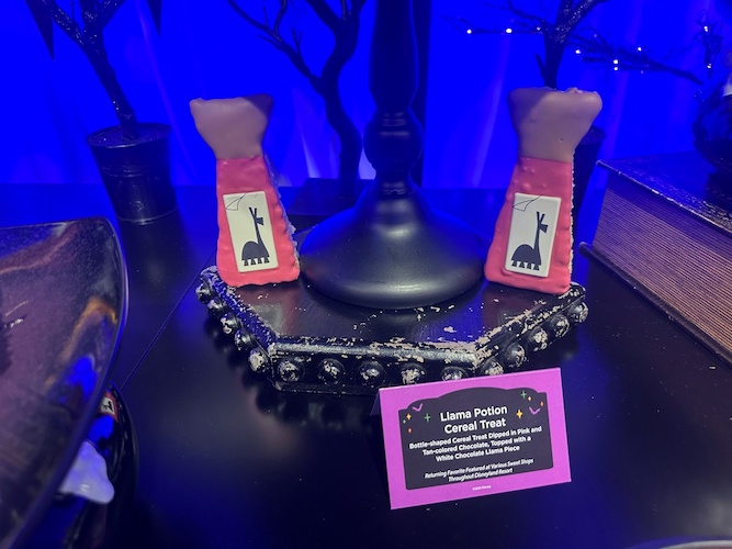 - Llama Potion Cereal Treat – Bottle-shaped Cereal Treat Dipped in Pink and Tan-colored Chocolate, Topped with a White Chocolate Llama Piece