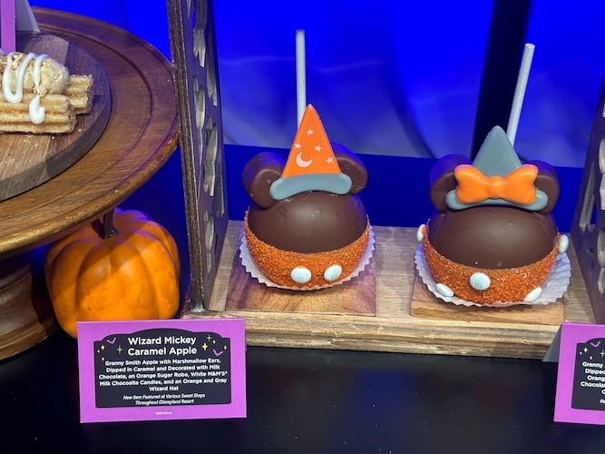 - Wizard Mickey Caramel Apple – Granny Smith Apple with Marshmallow Ears, Dipped in Caramel and Decorated with Milk Chocolate, an Orange Sugar Robe, White M&M'S Milk Chocolate Candies, and an Orange and Gray Wizard Hat