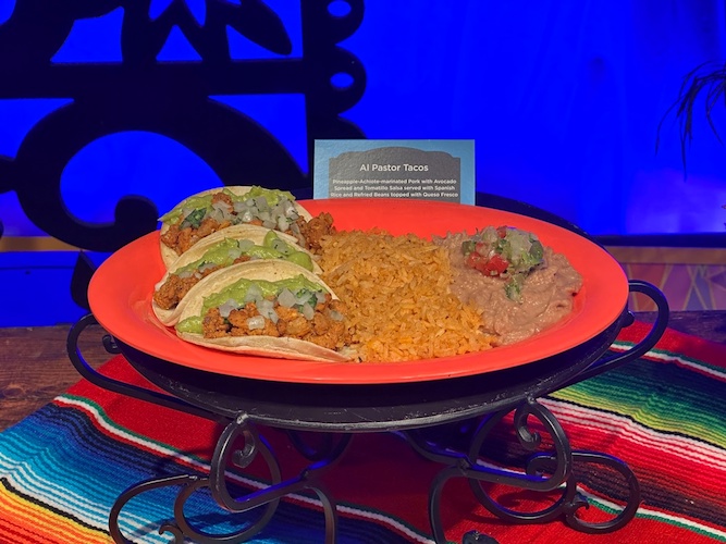 - Al Pastor Tacos: Pineapple-achiote-marinated pork with avocado spread and tomatillo salsa served with Spanish rice and refried beans topped with queso fresco