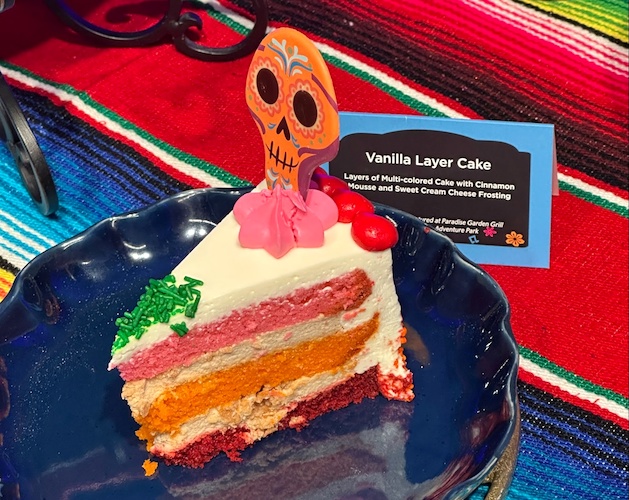 - Vanilla Layer Cake: Layers of multi-colored cake with cinnamon mousse and sweet cream cheese frosting
