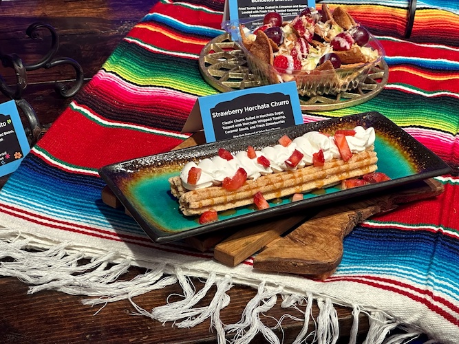 - Strawberry Horchata Churro: Classic churro rolled in horchata sugar, topped with horchata whipped topping, caramel sauce, and fresh strawberries (New)