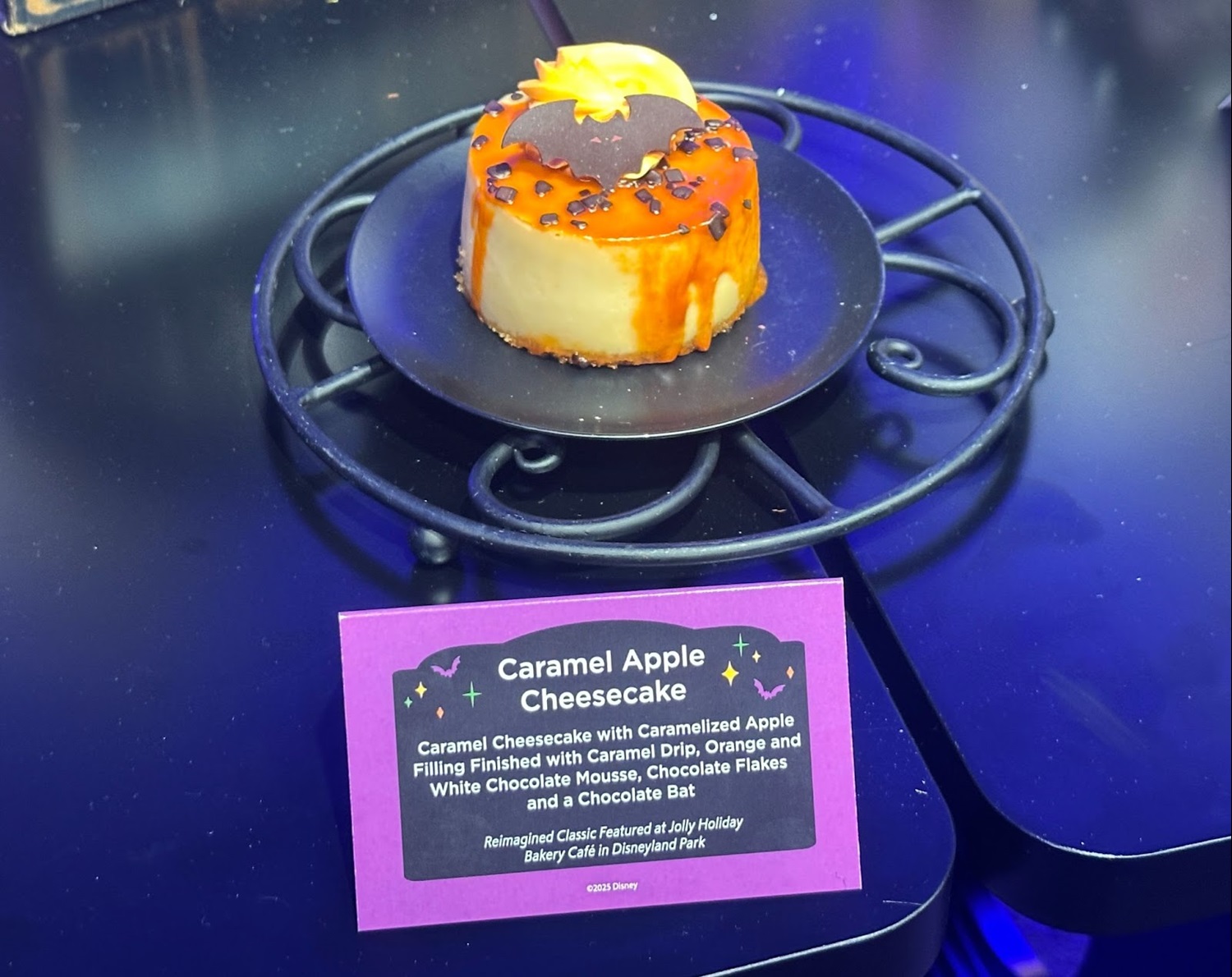 - Caramel Apple Cheesecake: Caramel cheesecake with caramelized apple filling finished with caramel drip, orange and white chocolate mousse, chocolate flakes, and a chocolate bat
