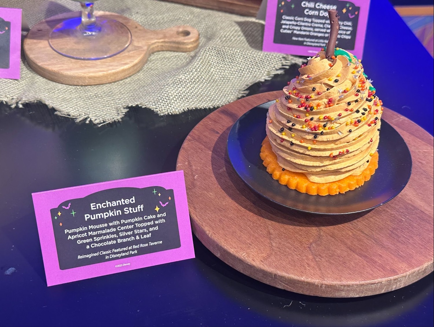- Enchanted Pumpkin Stuff: Pumpkin mousse with pumpkin cake and apricot marmalade center topped with green sprinkles, silver stars, and a chocolate branch and leaf