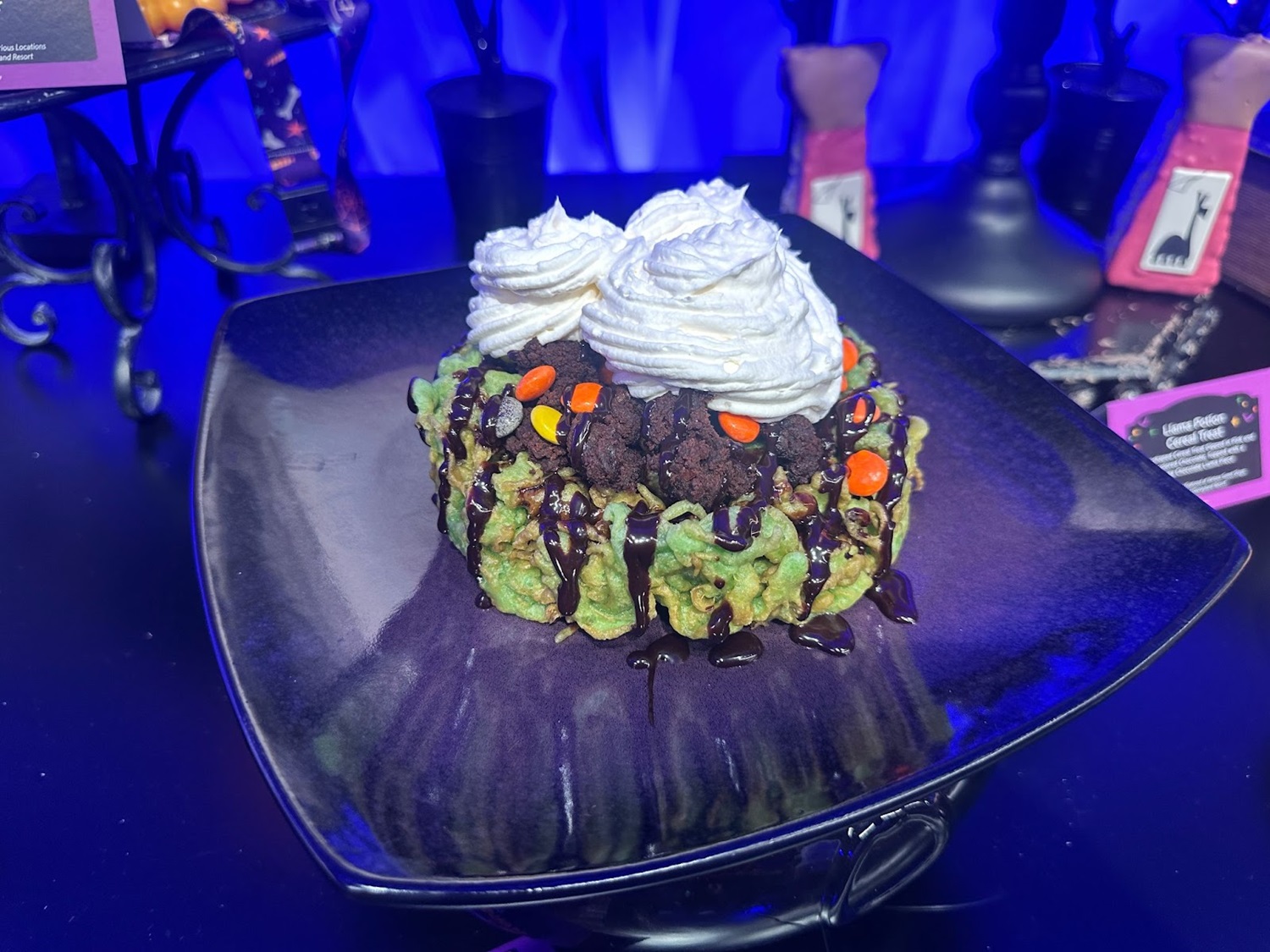 - The MONSTER Funnel Cake: Green funnel cake with chocolate sauce, crumbled brownie, peanut butter candy pieces, and whipped cream (New)