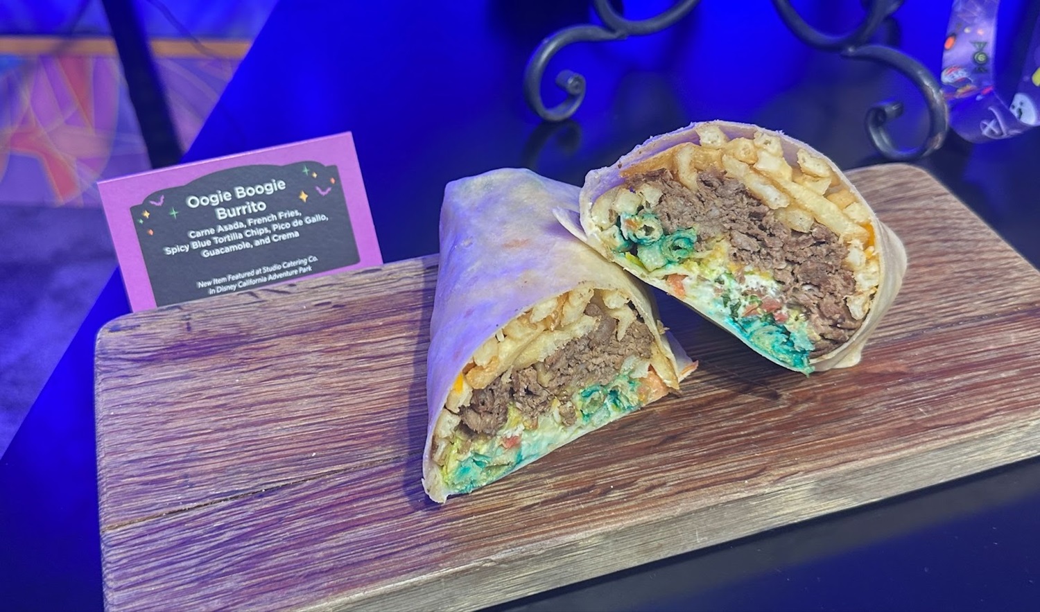- Oogie Boogie Burrito: Carne asada, French fries, spicy blue tortilla chips, pico de gallo, guacamole, and crema (New)