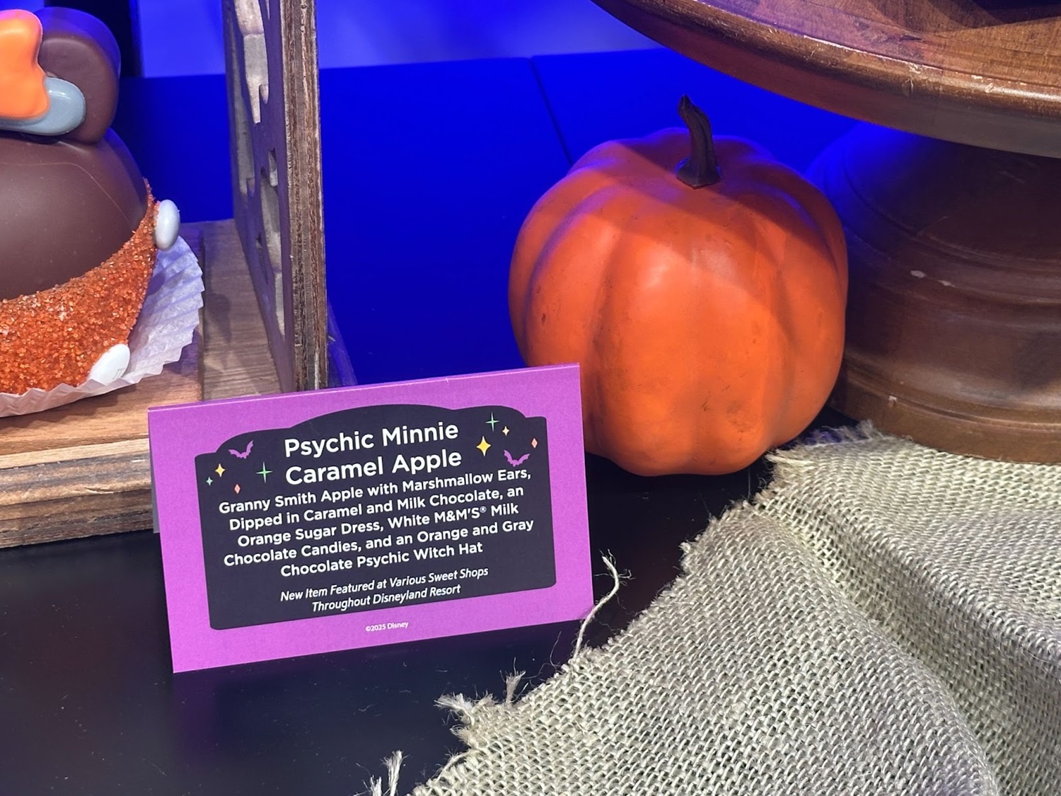- Psychic Minnie Caramel Apple – Granny Smith Apple with Marshmallow Ears, Dipped in Caramel and Milk Chocolate, an Orange Sugar Dress, White M&M'S Milk Chocolate Candies, and an Orange and Gray Chocolate Psychic Witch Hat
