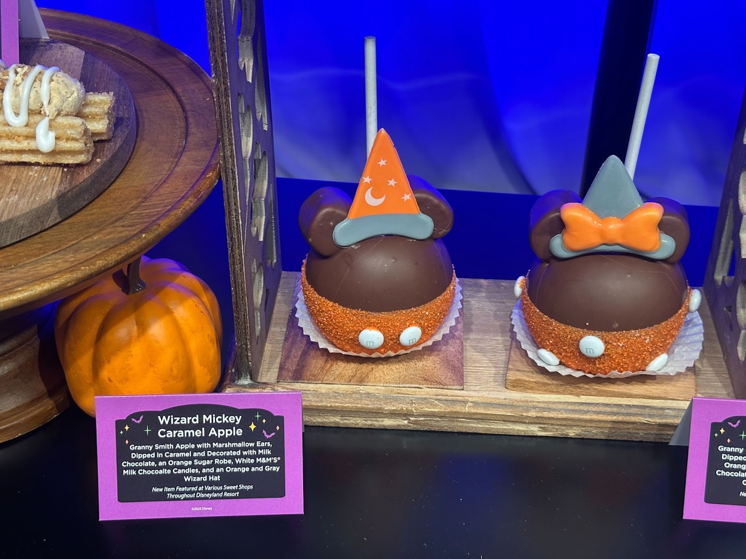 - Wizard Mickey Caramel Apple – Granny Smith Apple with Marshmallow Ears, Dipped in Caramel and Decorated with Milk Chocolate, an Orange Sugar Robe, White M&M'S Milk Chocolate Candies, and an Orange and Gray Wizard Hat