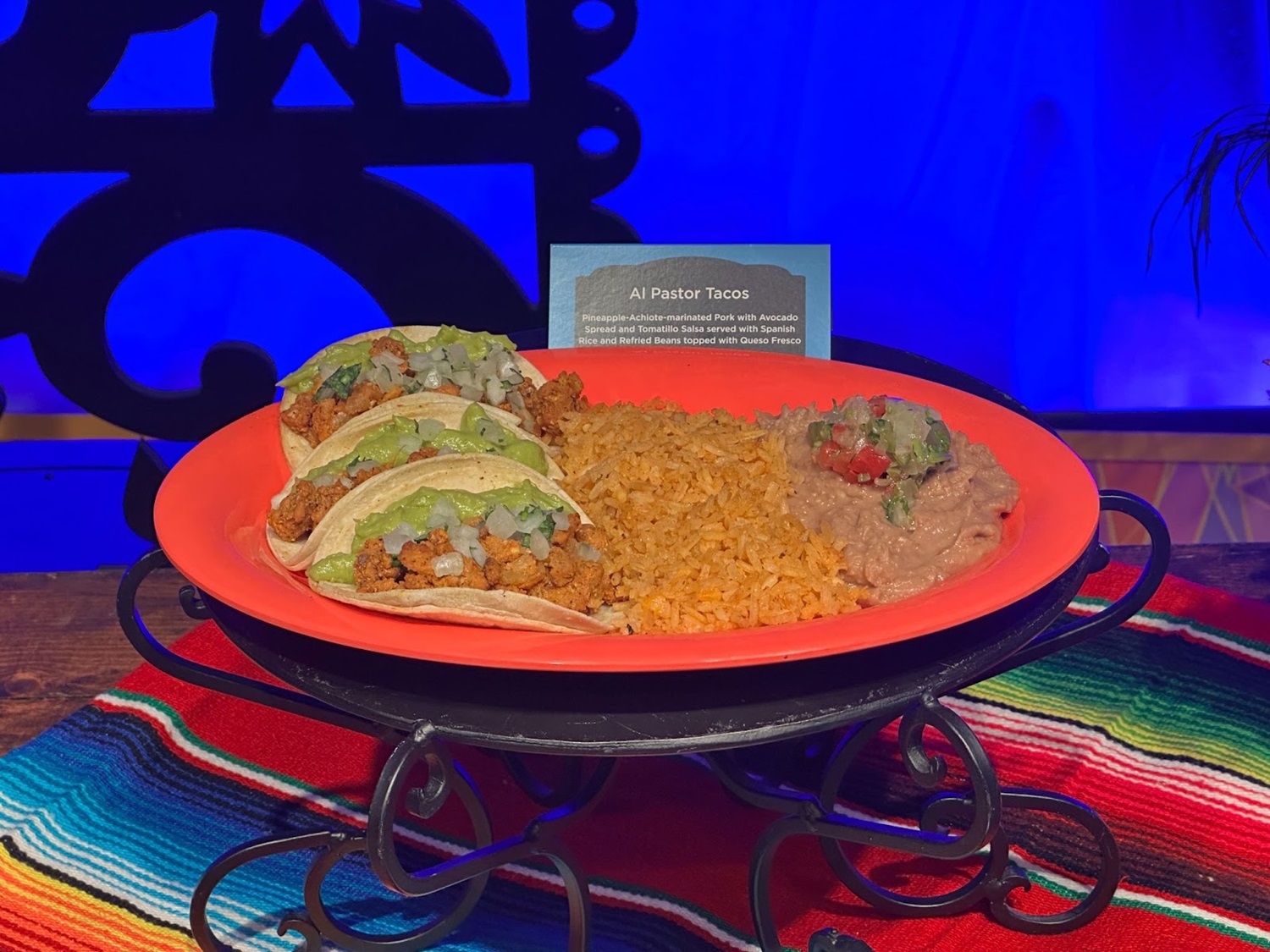 - Al Pastor Tacos: Pineapple-achiote-marinated pork with avocado spread and tomatillo salsa served with Spanish rice and refried beans topped with queso fresco