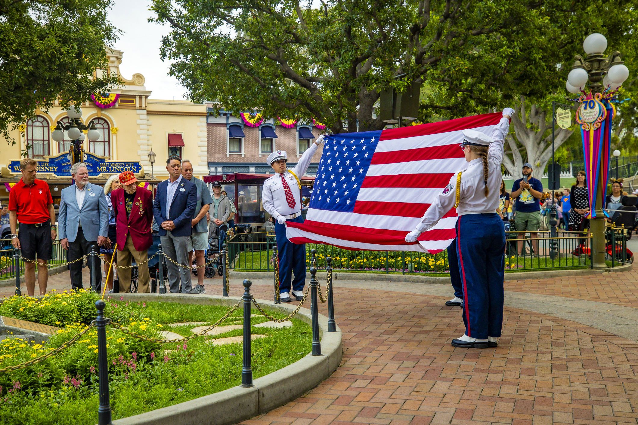 - 100-year-old World War II veteran Charles Cram was honored during the park’s daily Flag Retreat ceremony in Town Square today.