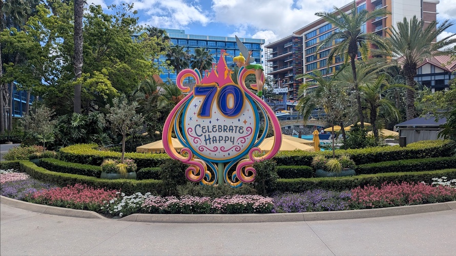 As soon as guests arrive for their stay at the Disneyland Hotel, they’ll immediately be greeted by some fun decor for the Disneyland Resort 70th Celebration.