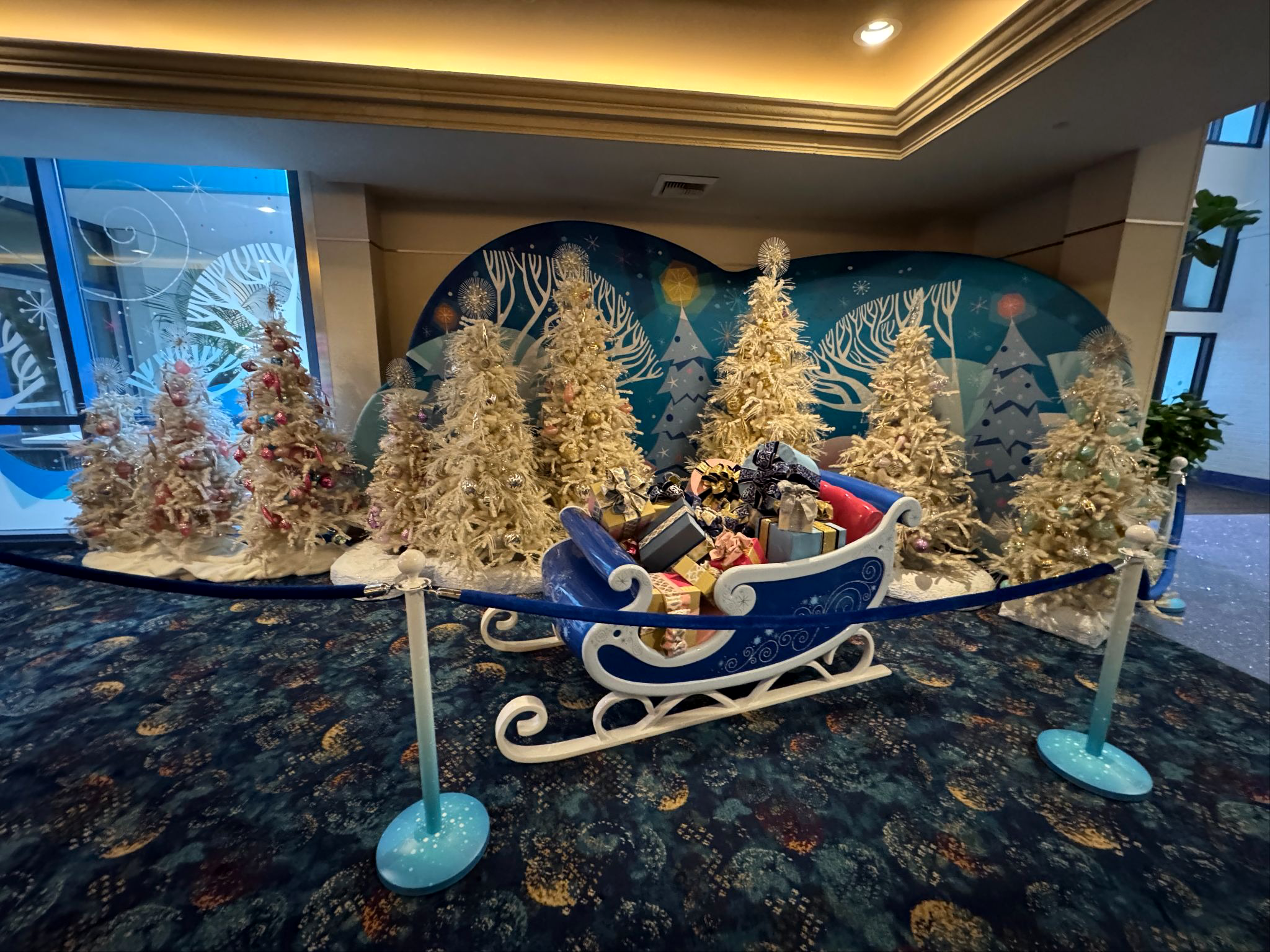 - Inside the hotel, there is also a Christmas tree display featuring a sleigh full of presents and a backdrop inspired by the hotel’s mid-century aesthetic.