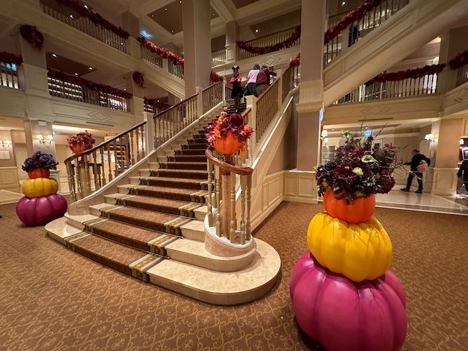 - On the guests’ path as they walk inside the lobby, two iconic Halloween pumpkins of unusual proportions have been placed at the bottom of the steps: these wooden sculptures, carved by the Disneyland Hotel carpenter, perfectly complement the season’s theme.