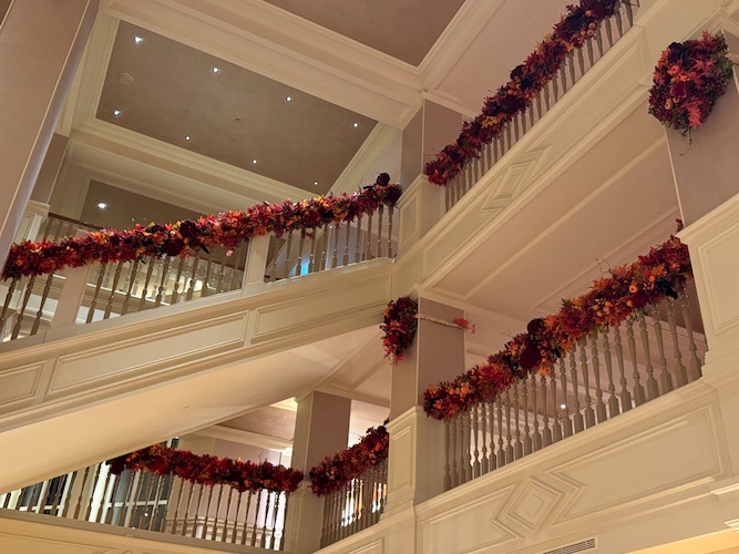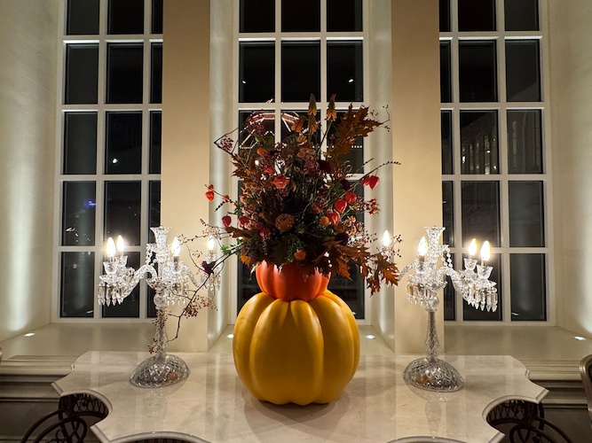 - As soon as guests arrive at the hotel, they’ll be greeted by a porch adorned with garlands of red and orange leaves, along with pumpkins topped with flowers placed around the fountain.