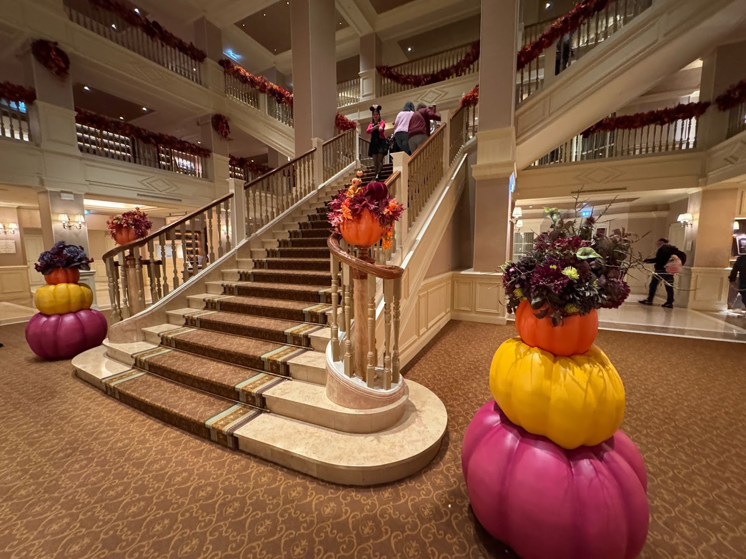 - On the guests’ path as they walk inside the lobby, two iconic Halloween pumpkins of unusual proportions have been placed at the bottom of the steps: these wooden sculptures, carved by the Disneyland Hotel carpenter, perfectly complement the season’s theme.