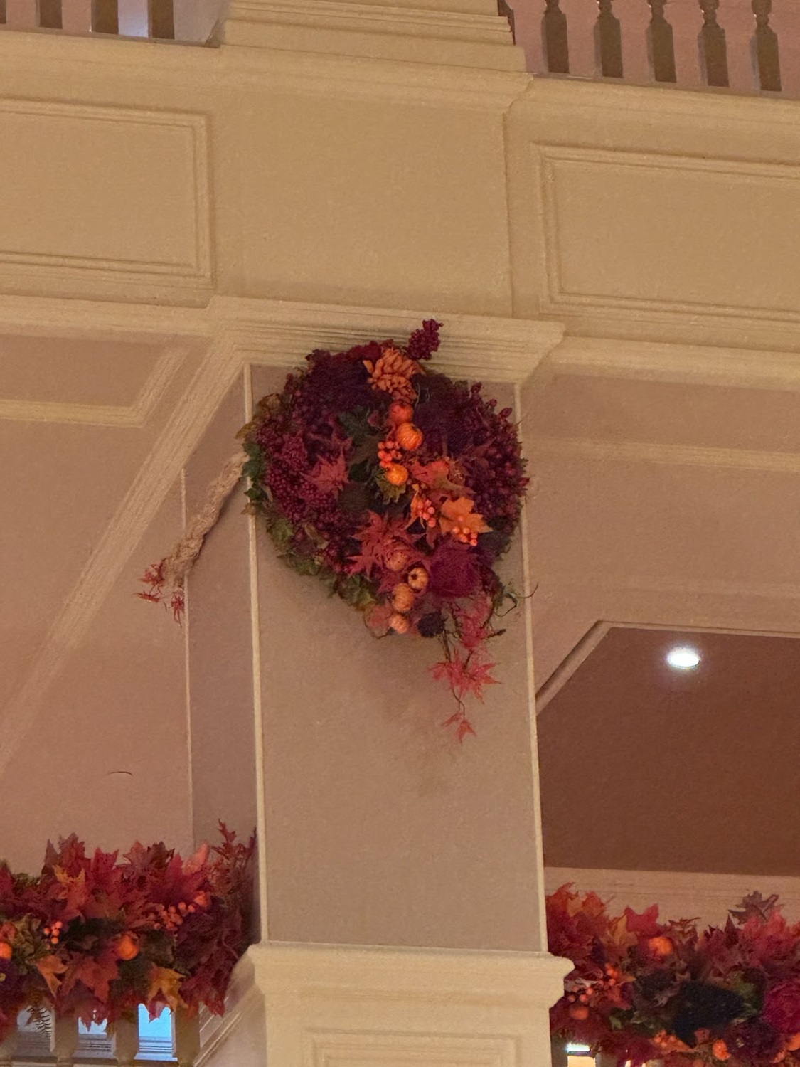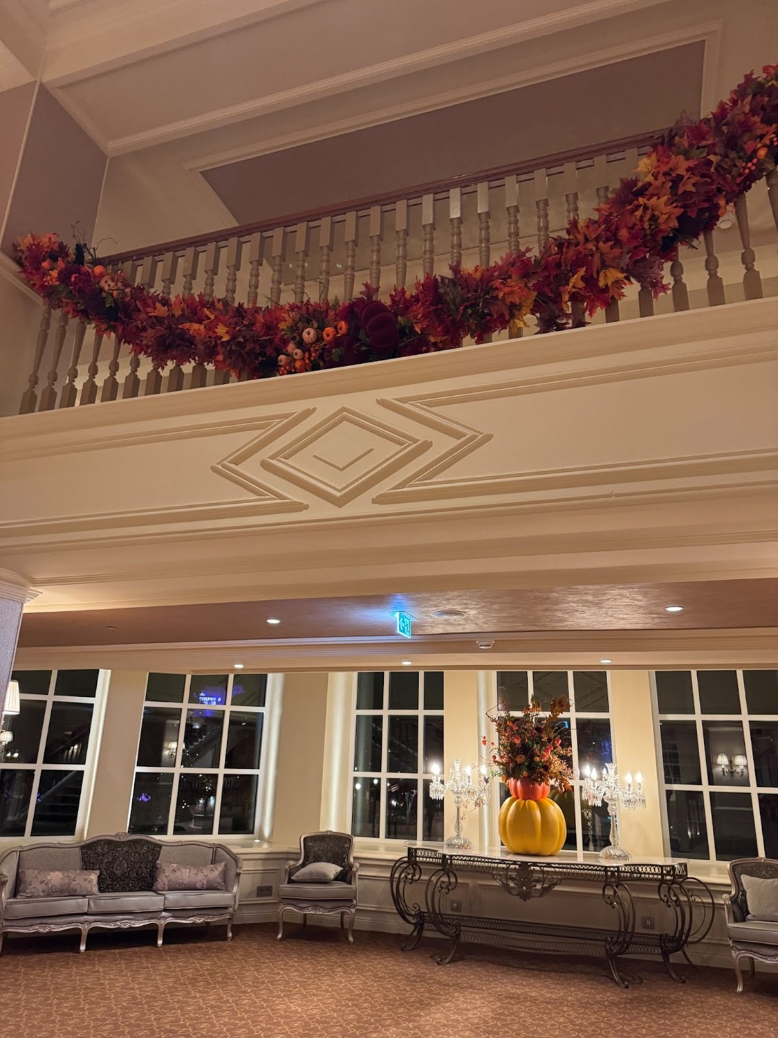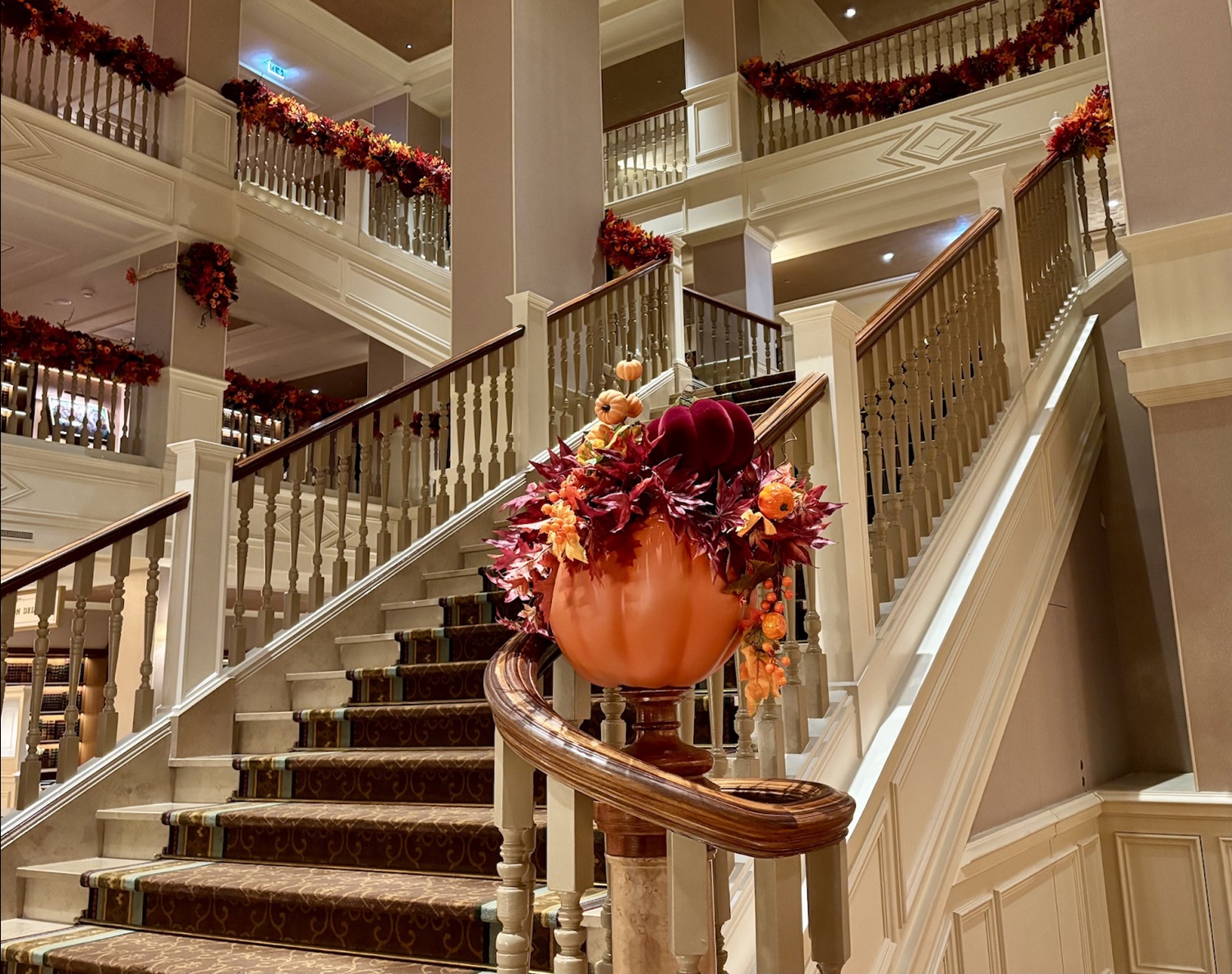 - As soon as guests arrive at the hotel, they’ll be greeted by a porch adorned with garlands of red and orange leaves, along with pumpkins topped with flowers placed around the fountain.