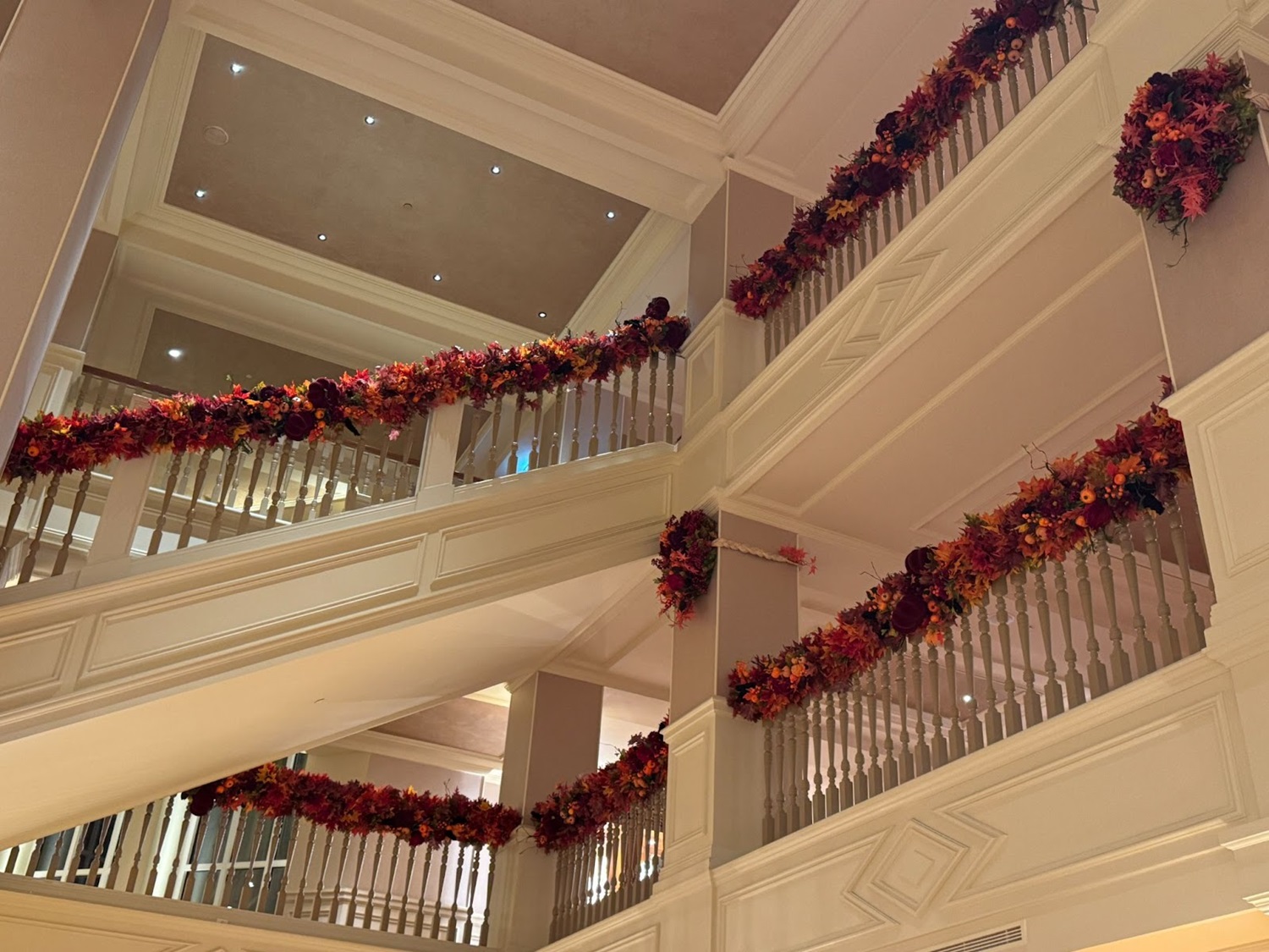 - The enchantment continues once inside the majestic lobby, as the beautiful garlands seen below frame the majestic lobby staircase and the railings of the first and second floors.