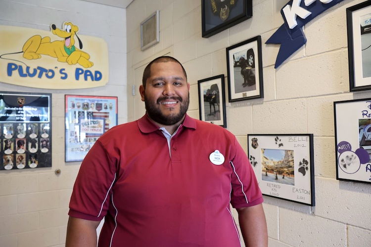 Amongst the team is Nicholas Hernandez, who has worked as a kennel technician for four years. Starting his role at the House of Mouse as a security guest screener, Nicholas quickly realized his passion for safety went beyond his role. Wanting to become a K-9 handler, Nicholas transferred to kennel technician in 2021, learning a greater appreciation for both the importance of security and working with the dogs.