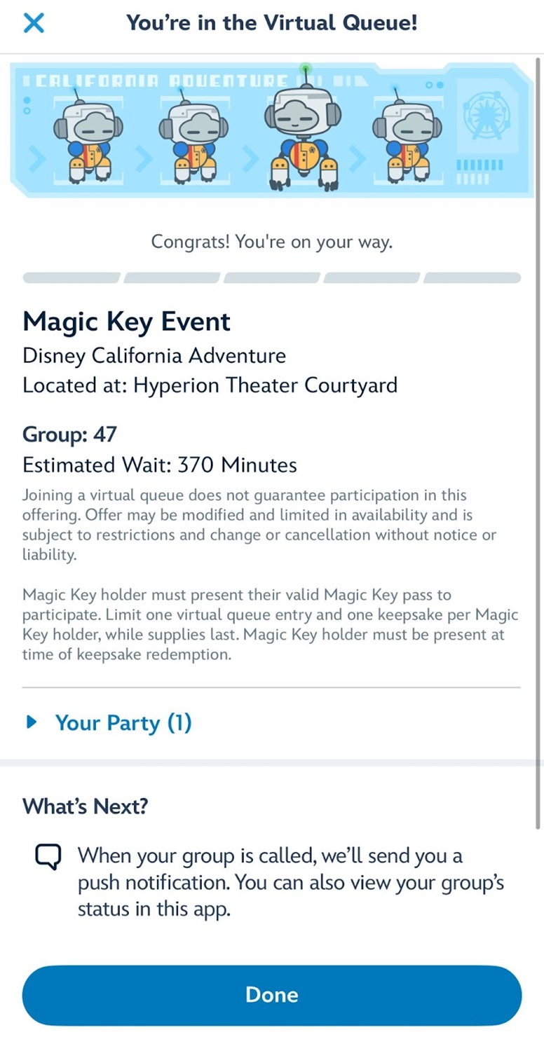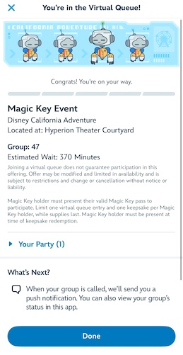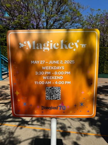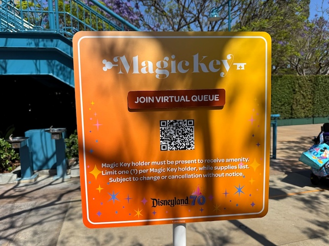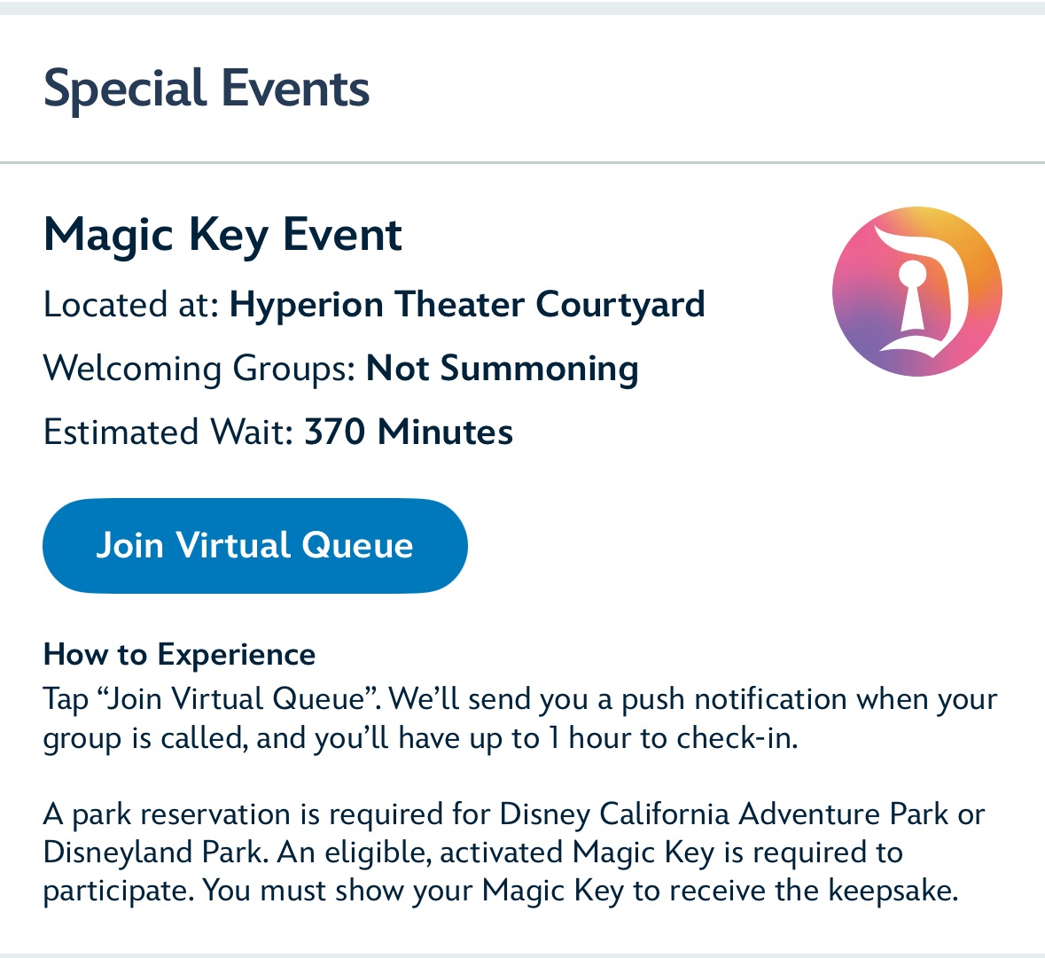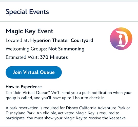 Magic Key holders are invited to stop by the Hyperion Theater Courtyard in Disney California Adventure between May 27th and June 2nd for a Magic Key 70th Celebration event. To access the area, Magic Key holders must join a Virtual Queue, which on the first day yesterday was quoted at a 370 minute wait for our reporter.