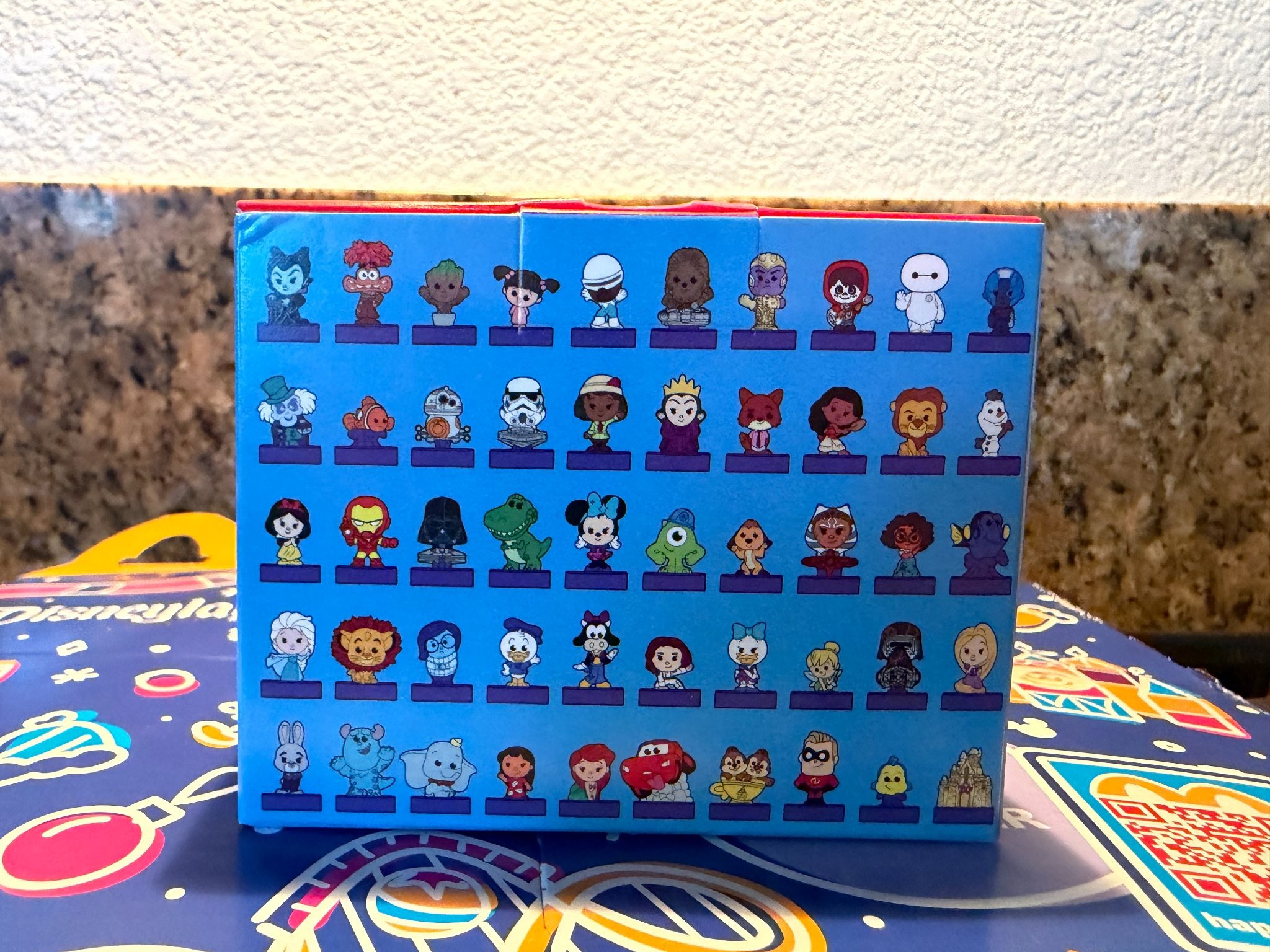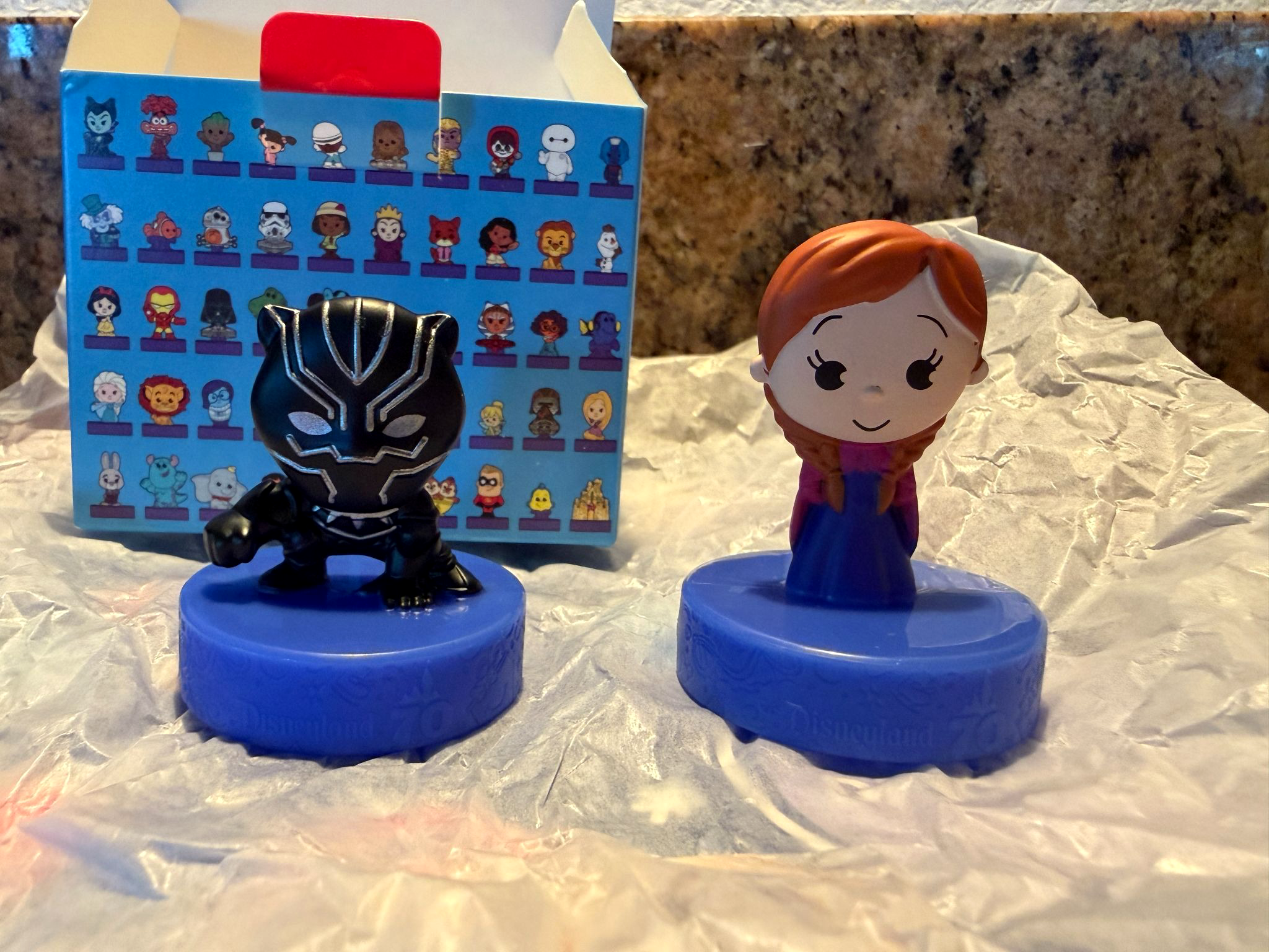 Here’s a closer look at two of the toy options. We got Anna from Frozen and Black Panther. These toys have a figure on a round plastic base etched with a design and the Disneyland 70 logo.