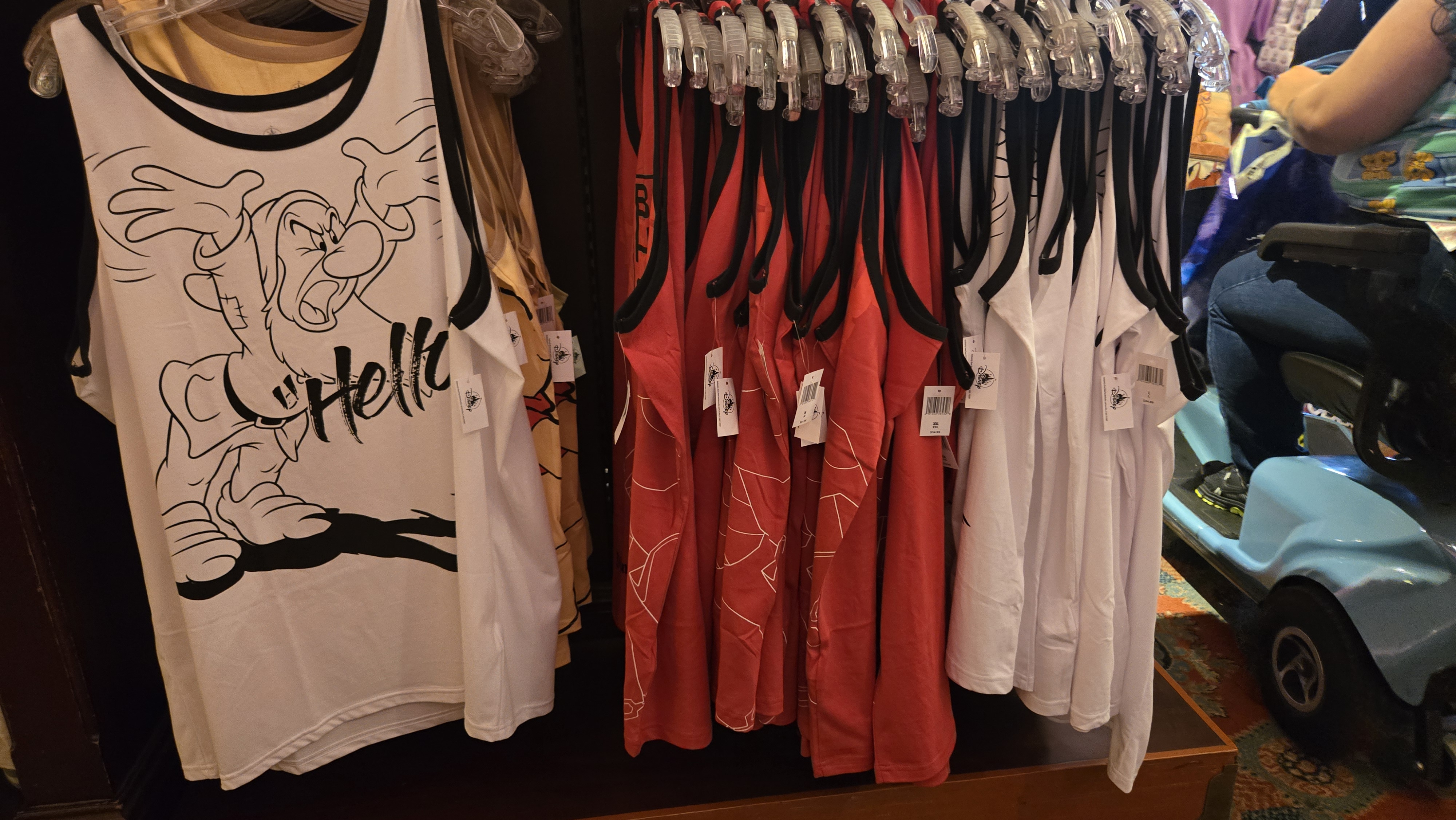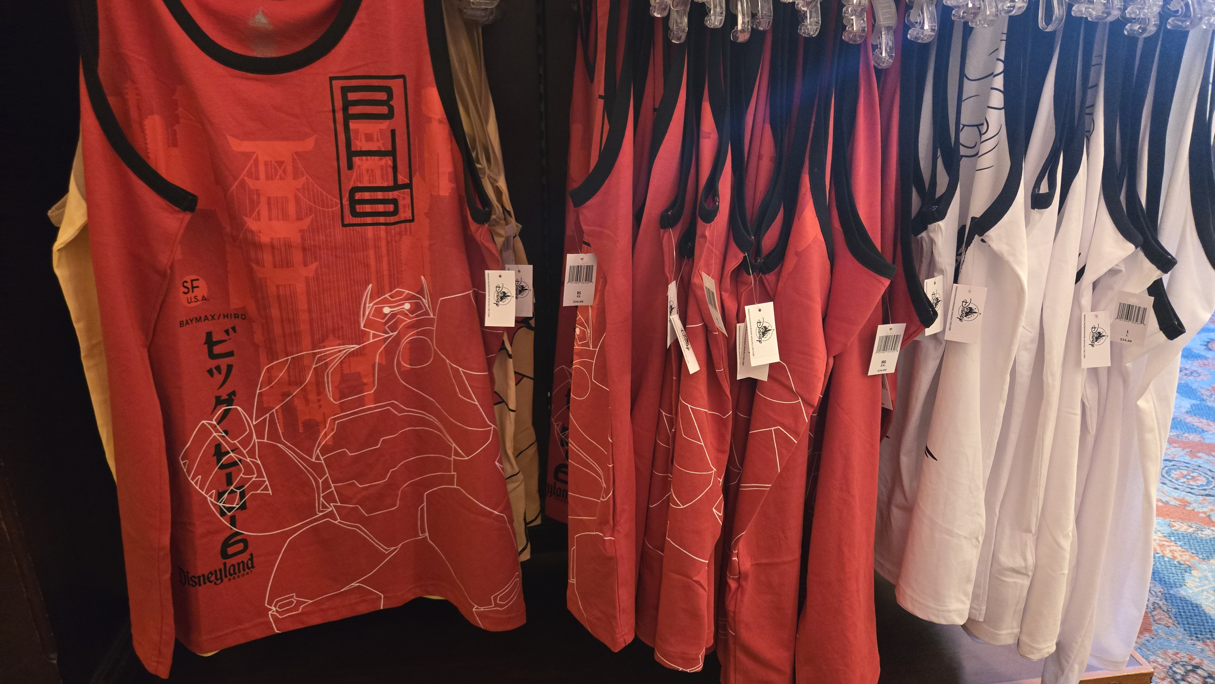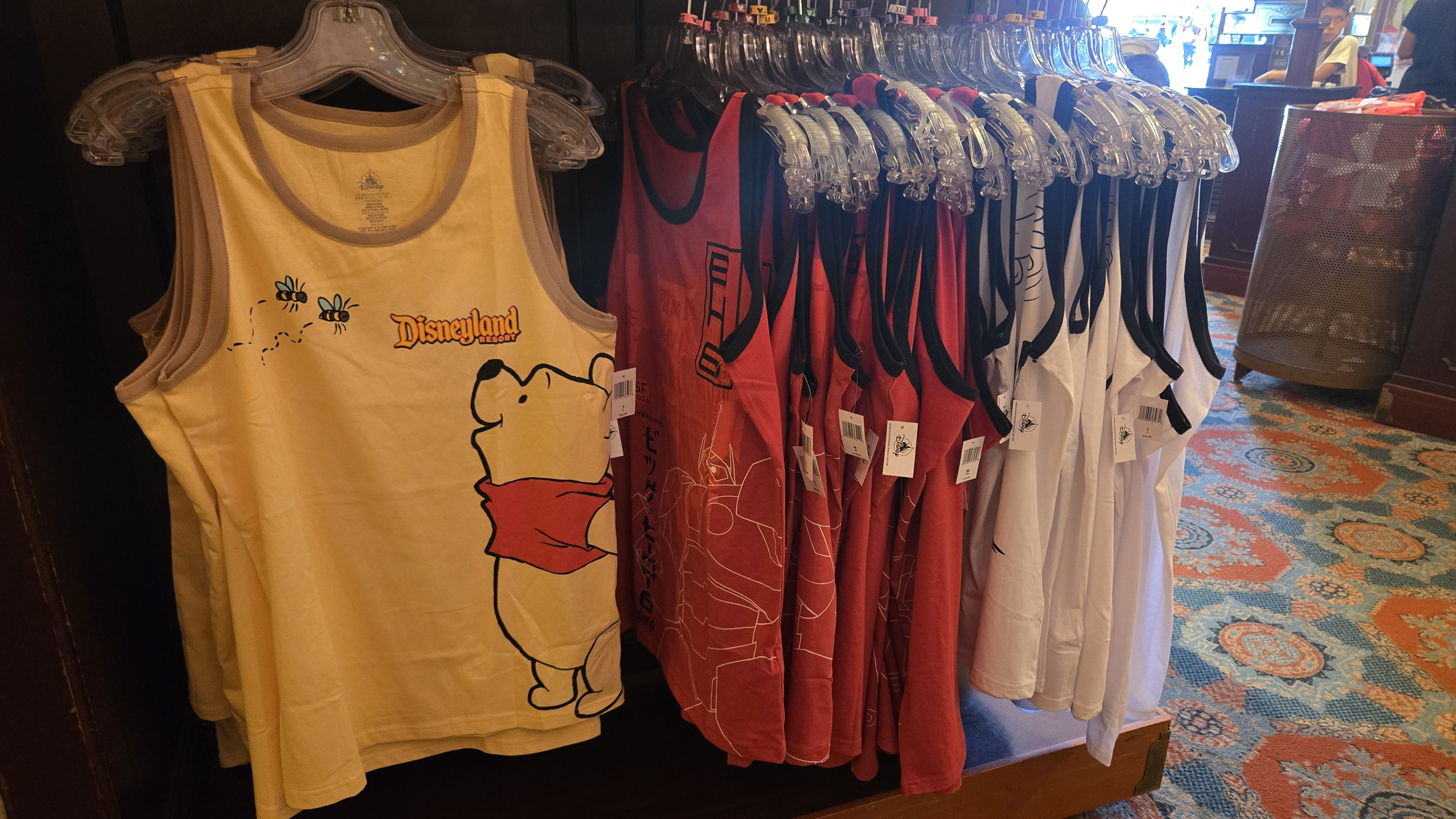 It's been a long time since we've seen dedicated tank tops at a Disney Parks gift shop, but we found some here. We found a white one featuring Grumpy with black lining, a red (again with black lining) featuring Baymax and Big Hero 6 iconography, and a yellow one featuring Winnie the Pooh, featuring a brown lining.