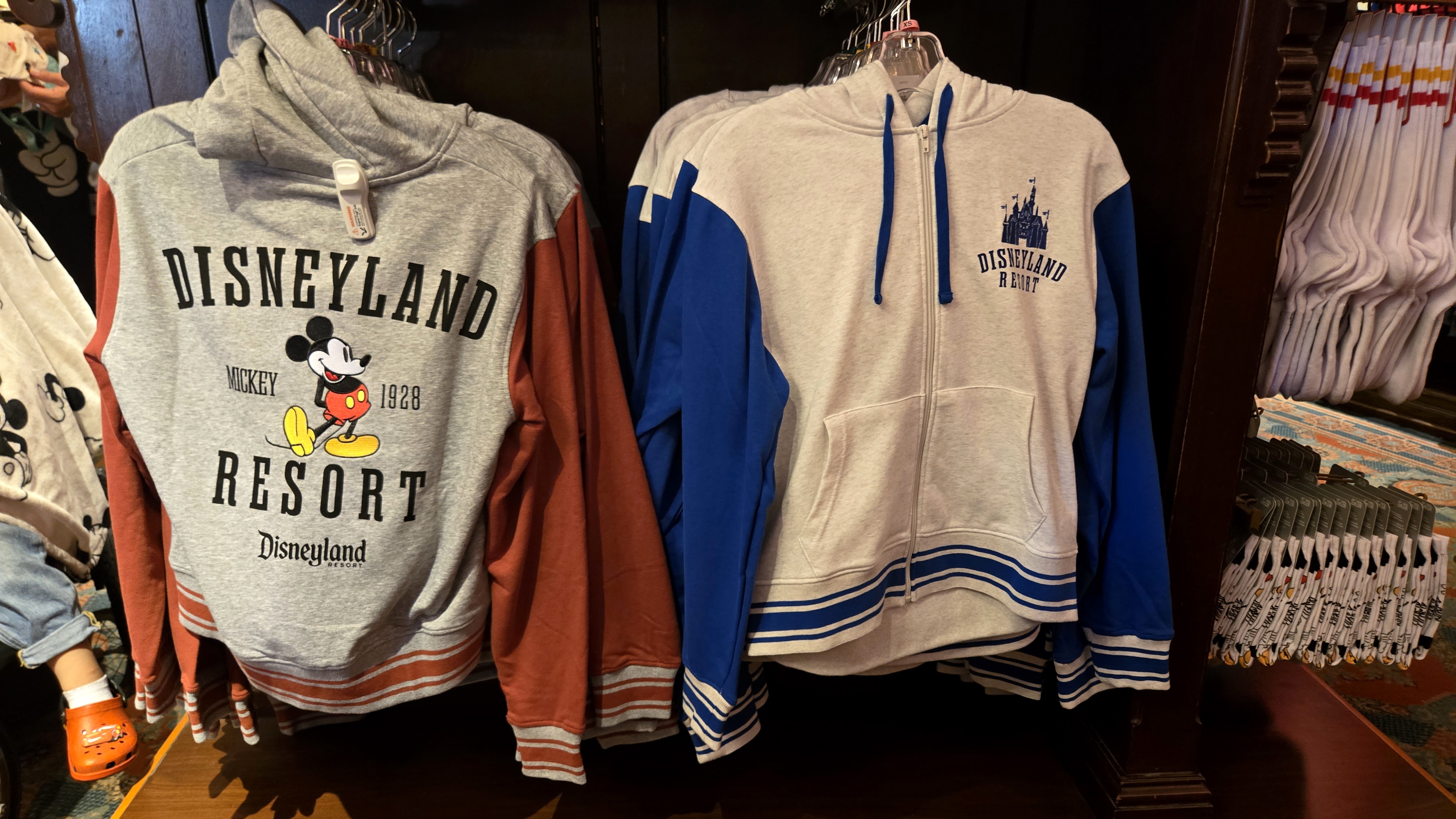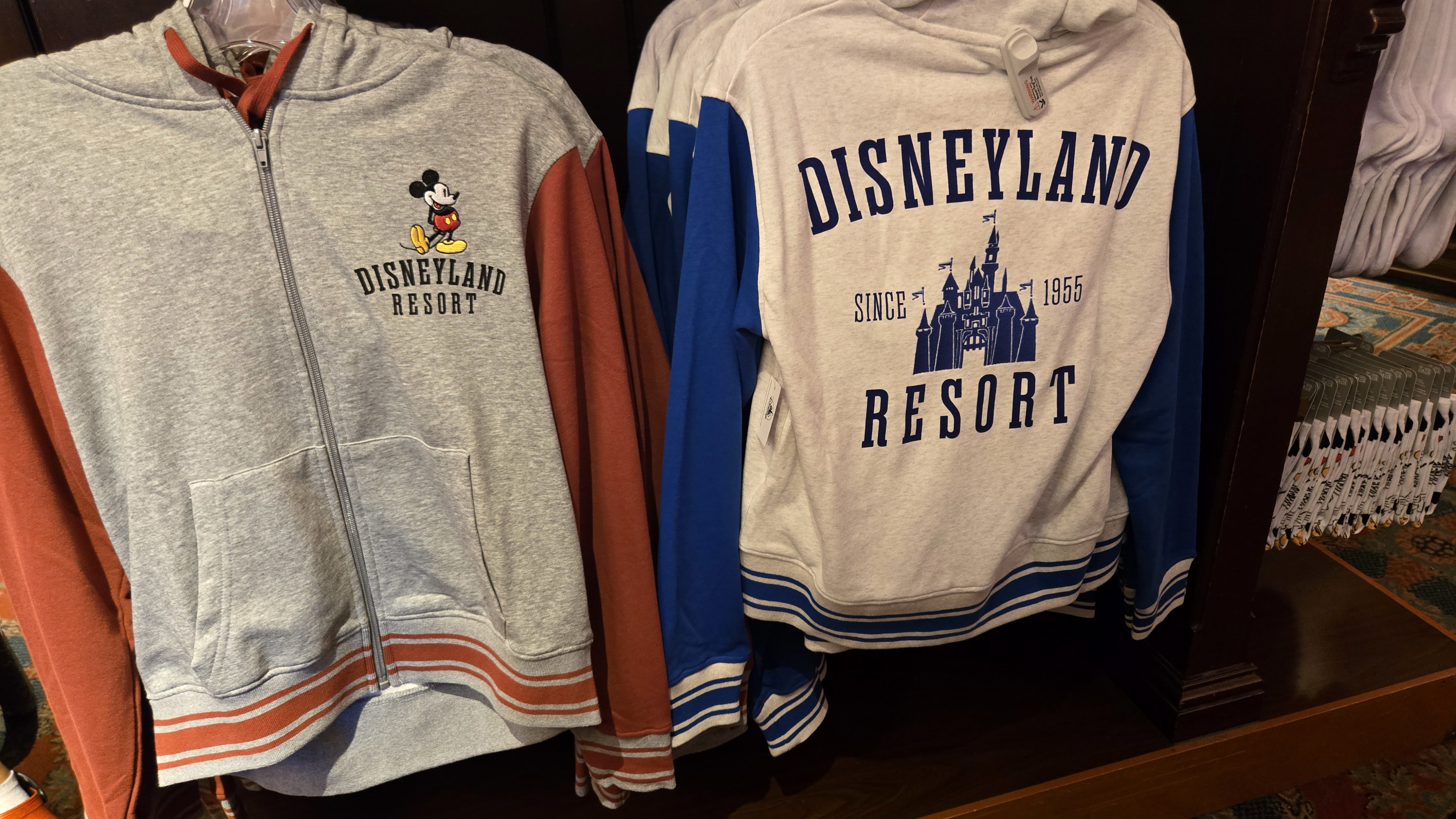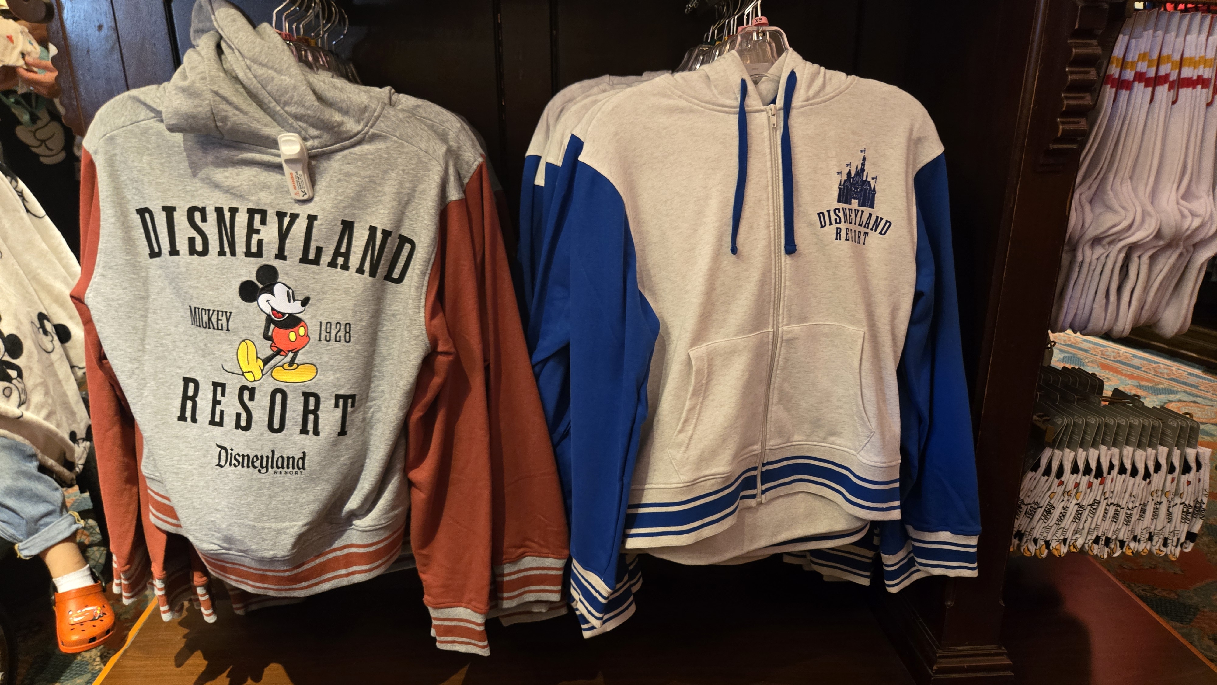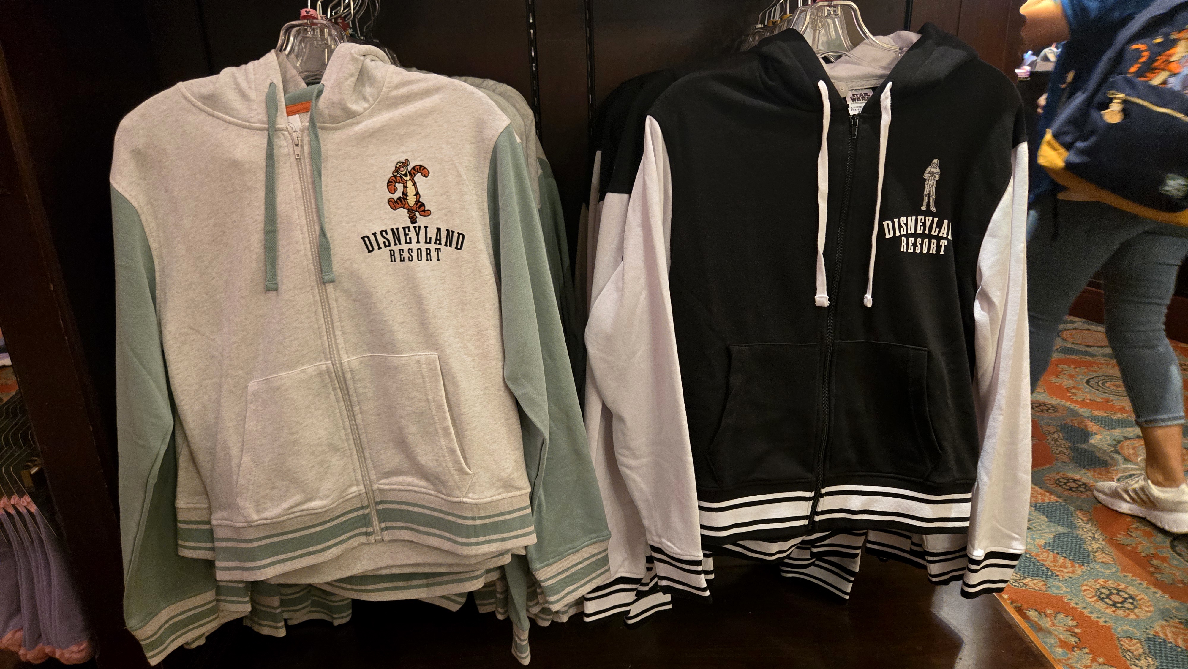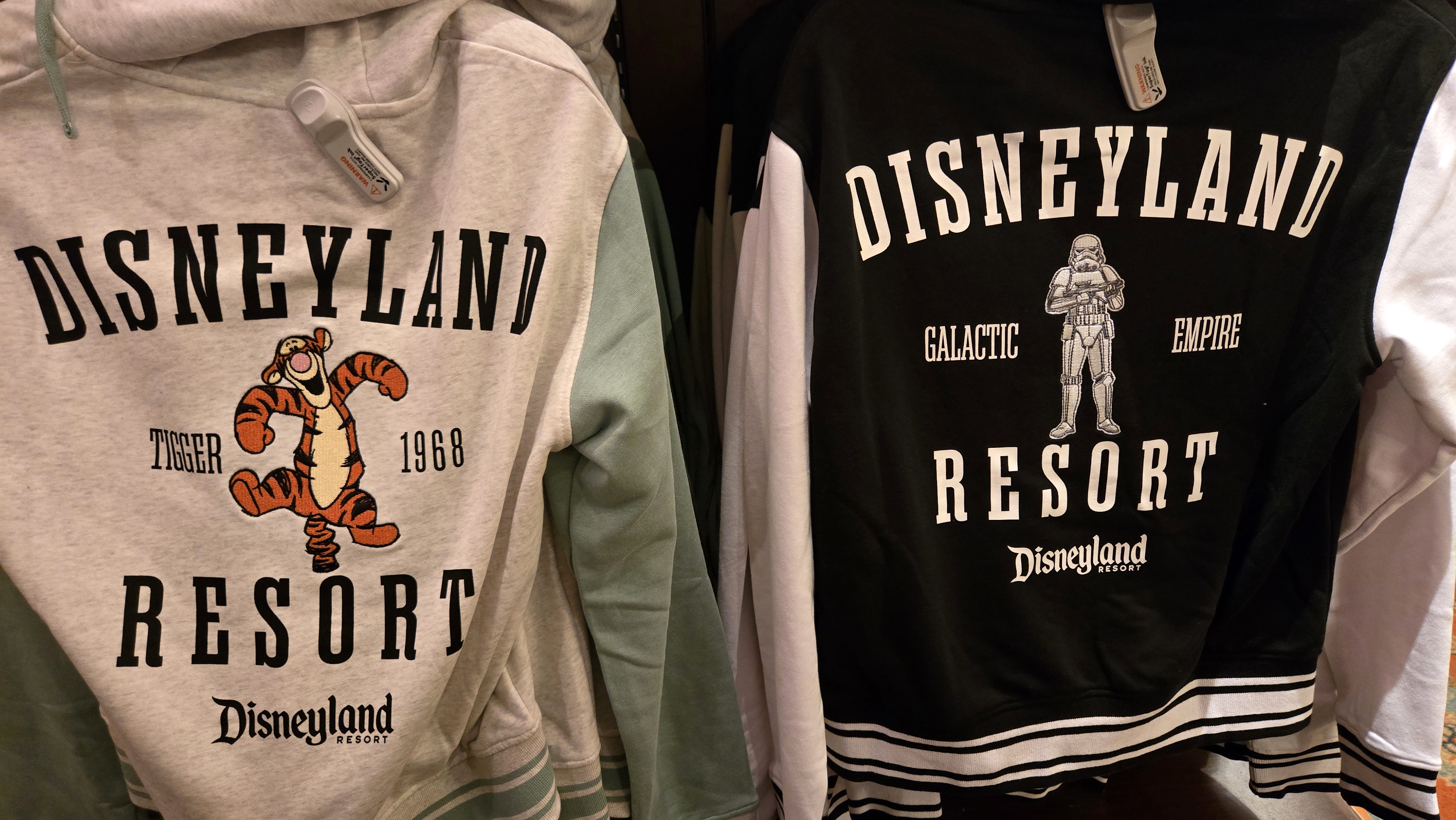 First up, we have some varsity style zip-up hoodies that feature the resort name alongside different characters. We found Tigger, a Stormtrooper, Mickey Mouse, and a generic castle design featuring blue sleeves.