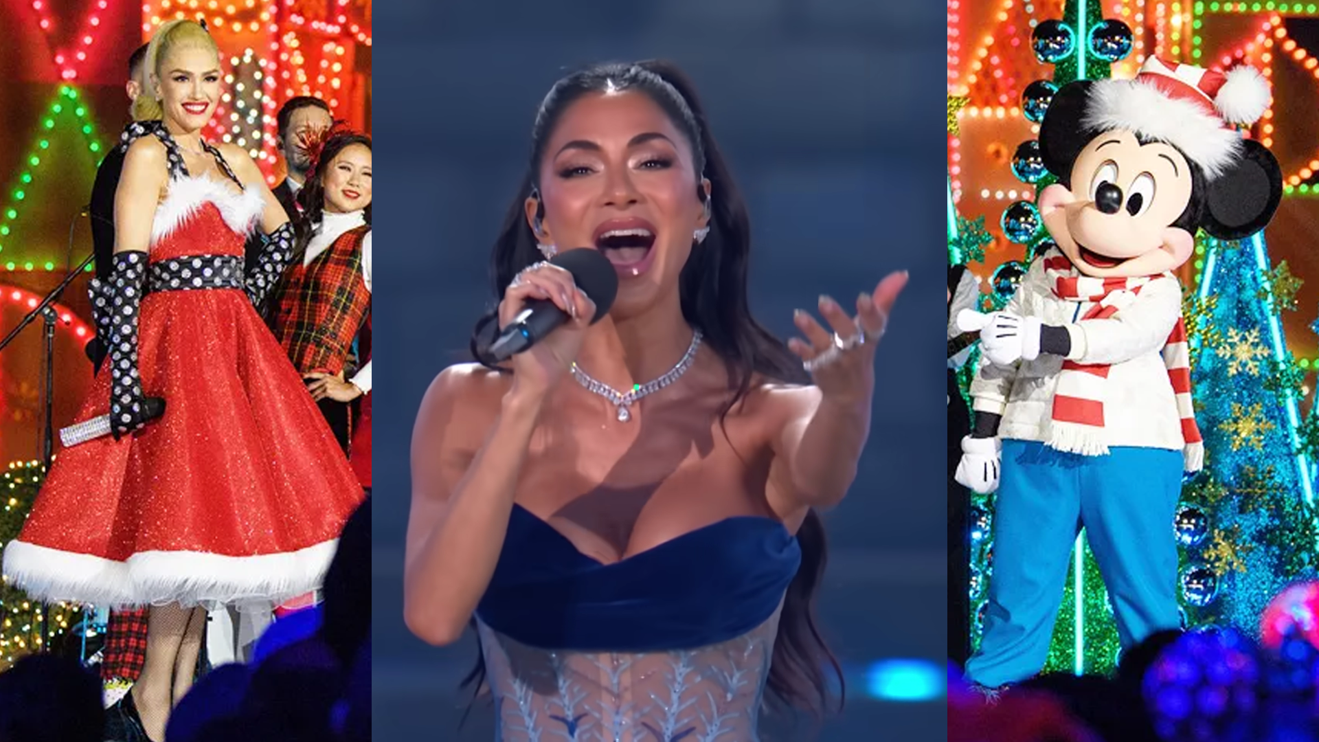 This is where we saw our first performance of the night: Nicole Scherzinger (from The Pussycat Dolls, The Masked Singer, Broadway's Sunset Boulevard, and Disney's Moana) singing "O Holy Night" mashed up with the song "Mary, Did You Know?" She did about four takes of the song-- one of which featured Chip n' Dale watching along-- and though she apologized for her voice being off because she hadn't been feeling well, she sounded great. In-between takes we were entertained by a funny warm-up artist, and we were also distributed finger lights to wear and wave back and forth during the song.