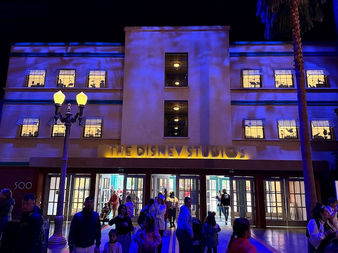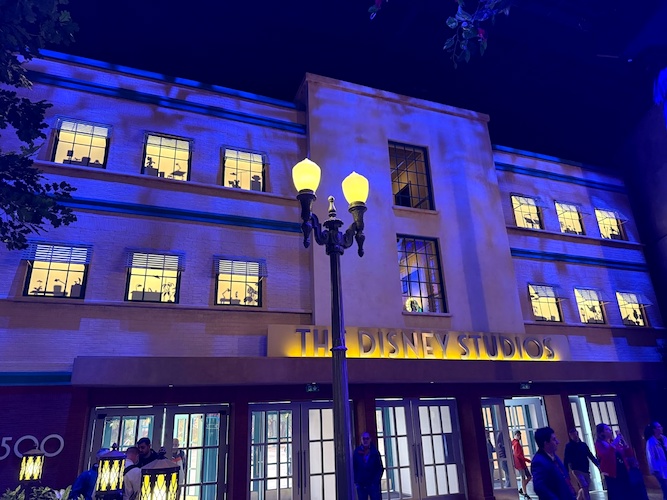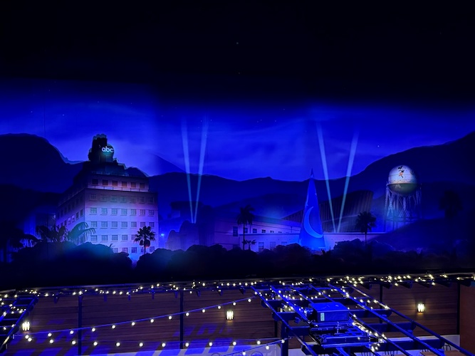 With the 1940s at the entrance, the exit to World Premiere depicts The Walt Disney Studios as it exists today. Beautiful murals surround the Disney Theater, where you’ll see the studio’s water tower, the new animation building, and the headquarters of Disney’s TV empire, ABC. Projected spotlights, rolling clouds, and twinkling stars make these murals come alive.