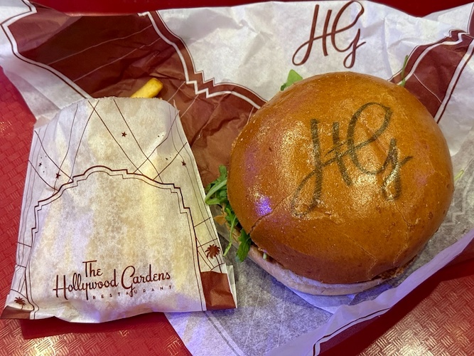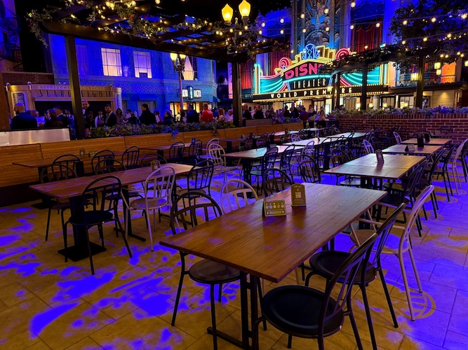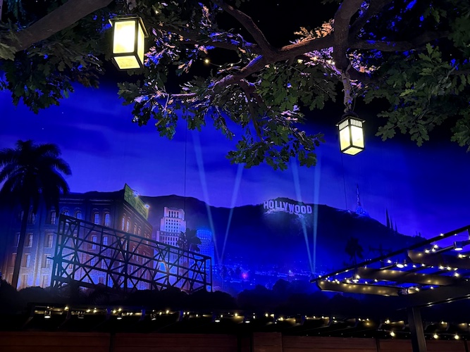 Step into the soundstage to find yourself transported to the glitz and glamour of the golden age of Hollywood. Recreations of iconic Hollywood buildings house shops on the left-hand side, while a beautiful outdoor garden area on the right becomes a quick-service dining area. And as a weinie, drawing you out of the soundstage and into the park, is a movie theater. After all, Walt Disney Studios (and Disney Adventure World) invite Guests to step inside their favorite films.
