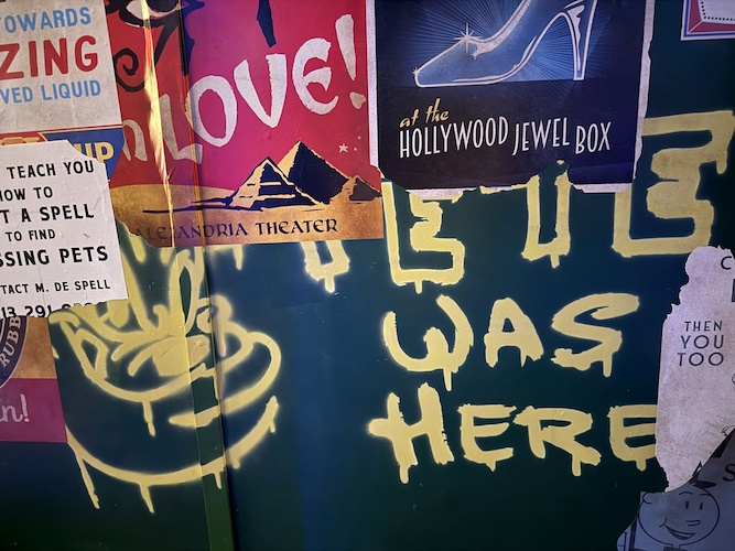 Anyone who's ever been to Hollywood knows it’s not as glamorous as the movies would have you believe. This alley space is littered with graffiti and ads, and here, we find another bounty of references.