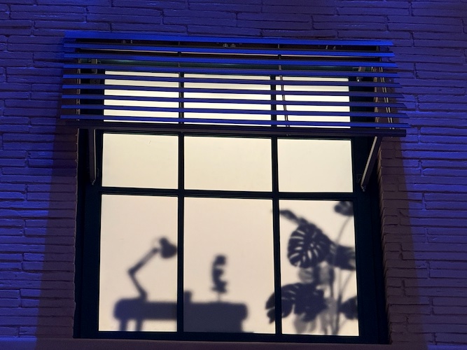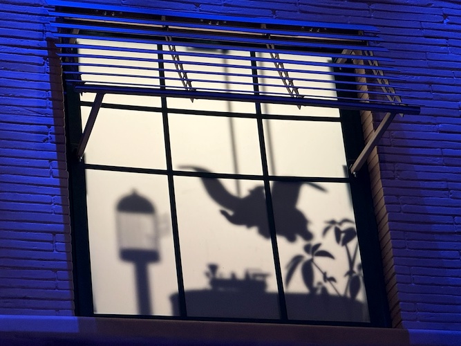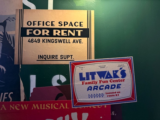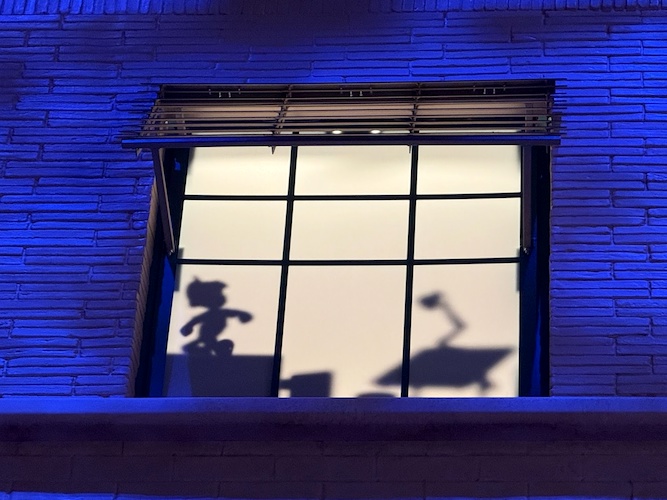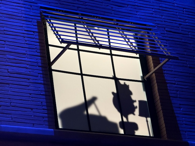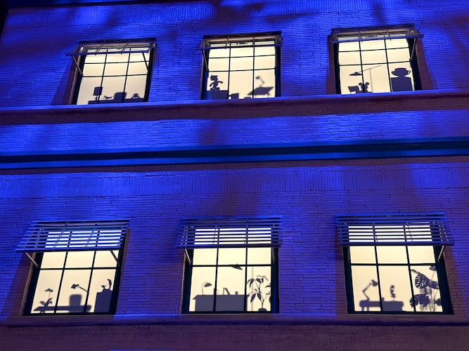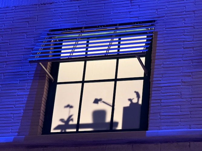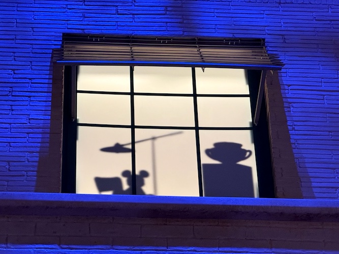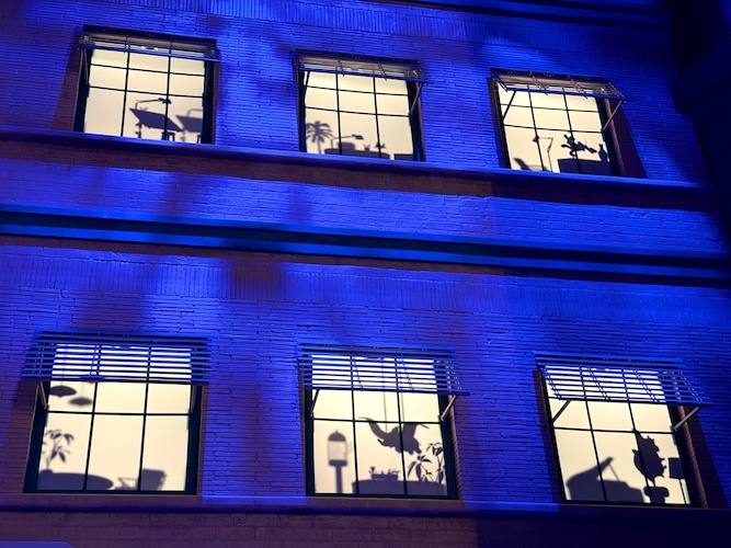 Pay close attention to the windows for some hidden surprises. Animation buffs will note the silhouettes of Kem Weber’s furniture, including an airline chair and animation desks.