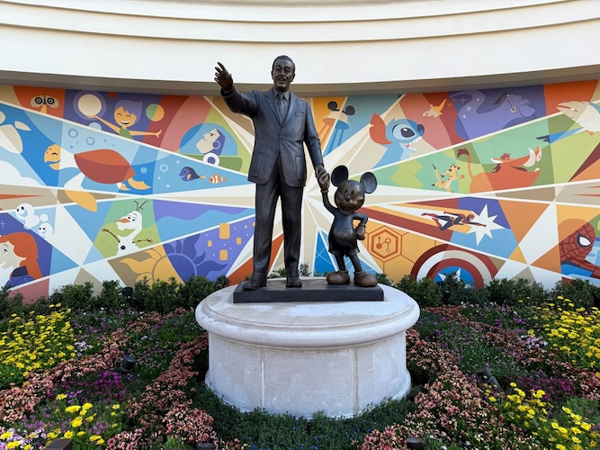 Walt and Mickey are surrounded by a new mural, featuring stylized characters that will call Disney Adventure World home. From current characters like Remy, Lightning McQueen, Stitch, and the Avengers, to future expansions from Frozen, The Lion King, and Tangled, Walt and Mickey are looking forward to the evolution of Walt Disney Studios.