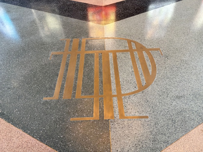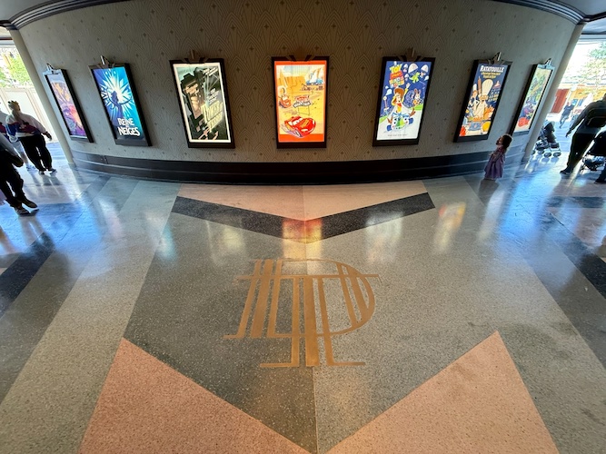 The flooring in the lobby also features a gold inlay “DT," for Disney Theater.