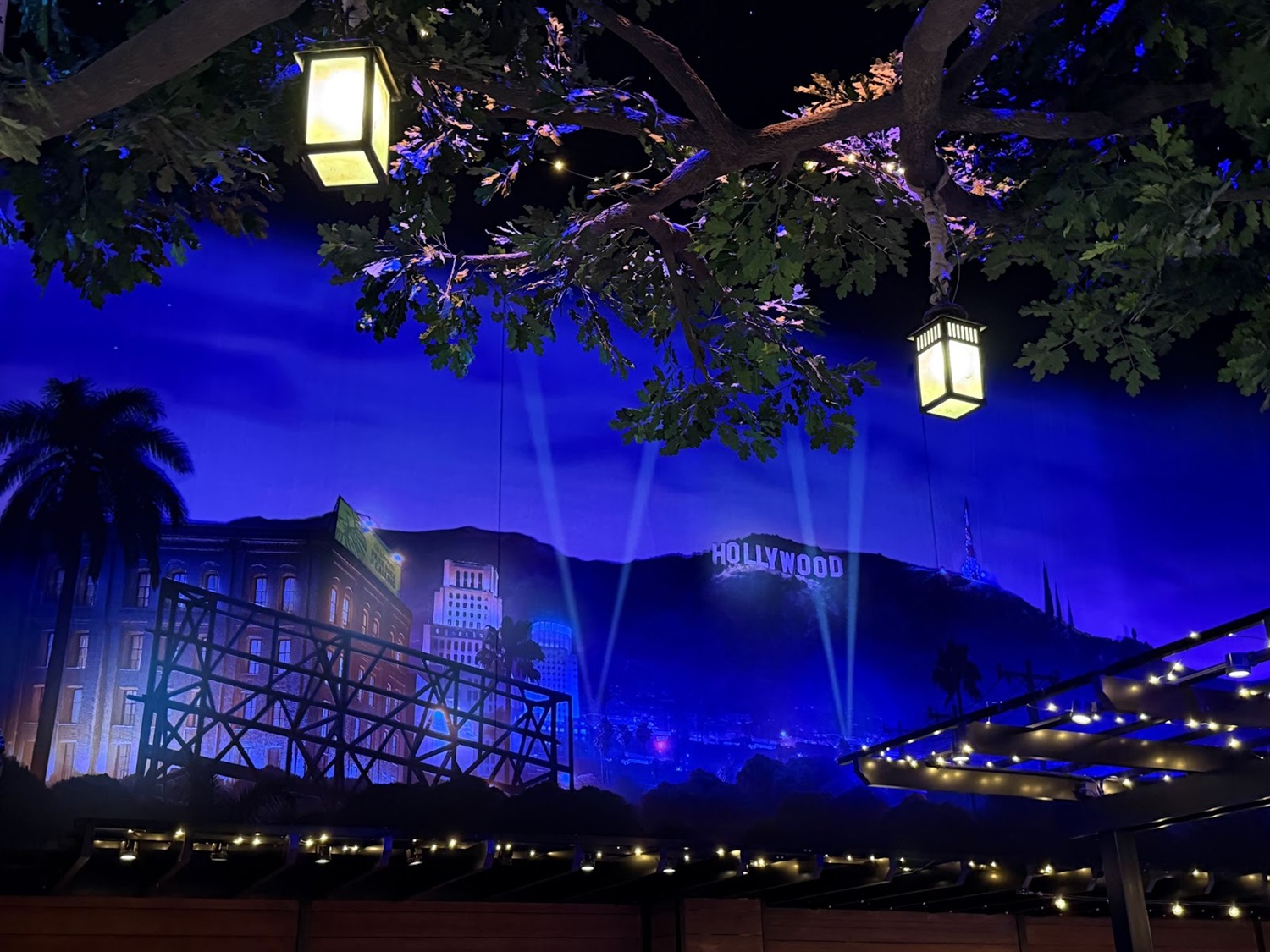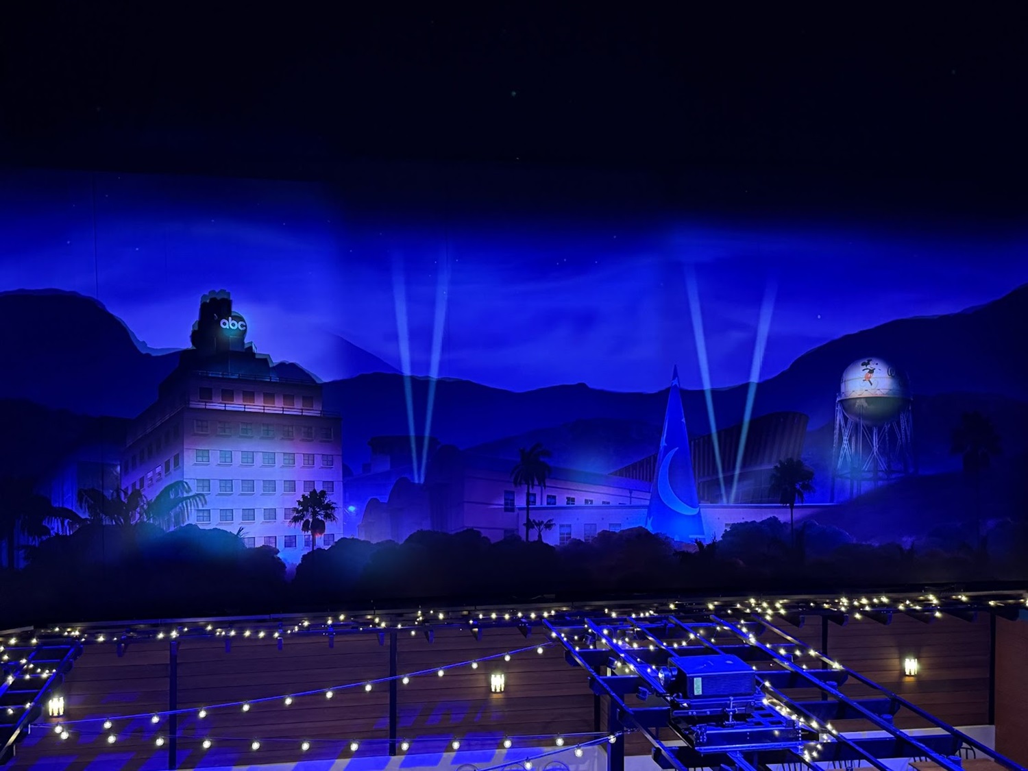 With the 1940s at the entrance, the exit to World Premiere depicts The Walt Disney Studios as it exists today. Beautiful murals surround the Disney Theater, where you’ll see the studio’s water tower, the new animation building, and the headquarters of Disney’s TV empire, ABC. Projected spotlights, rolling clouds, and twinkling stars make these murals come alive.