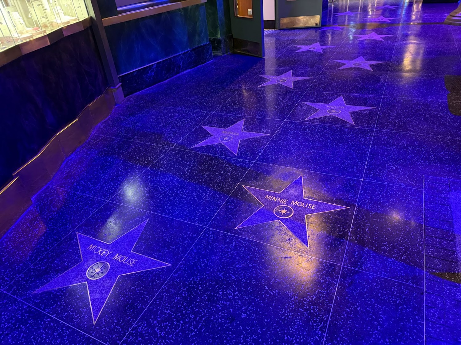 The flooring in the lobby also features a gold inlay “DT," for Disney Theater.