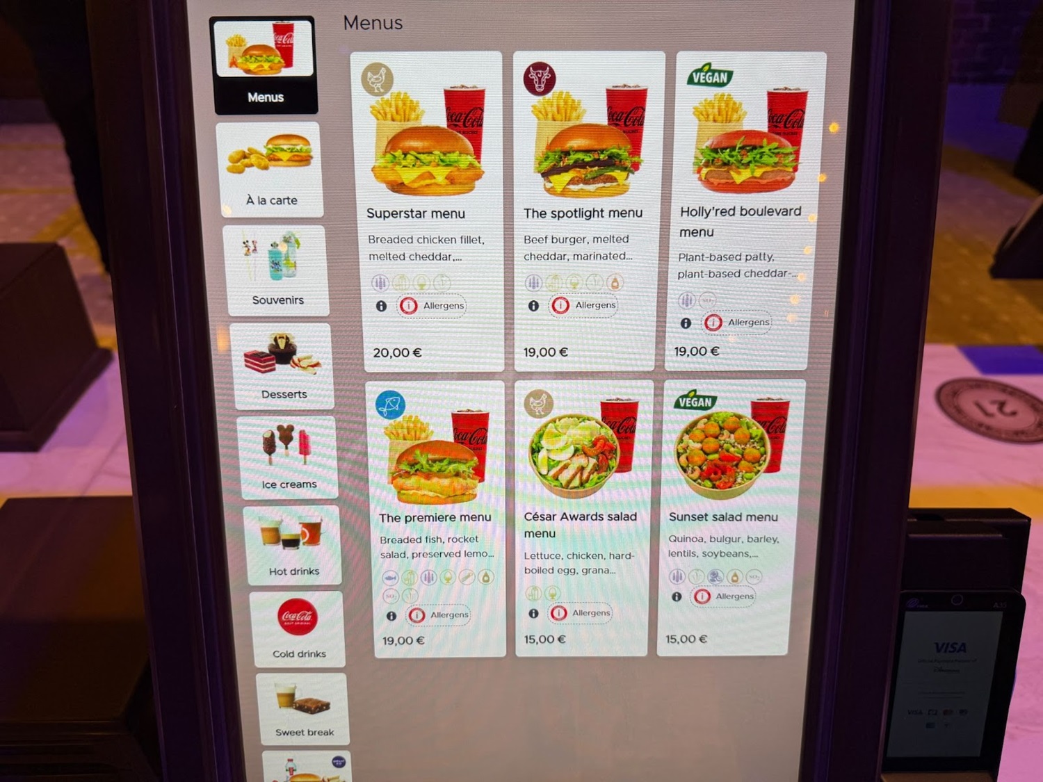 The menu includes chicken, beef, fish, and plant-based burgers, plus two kinds of salad.