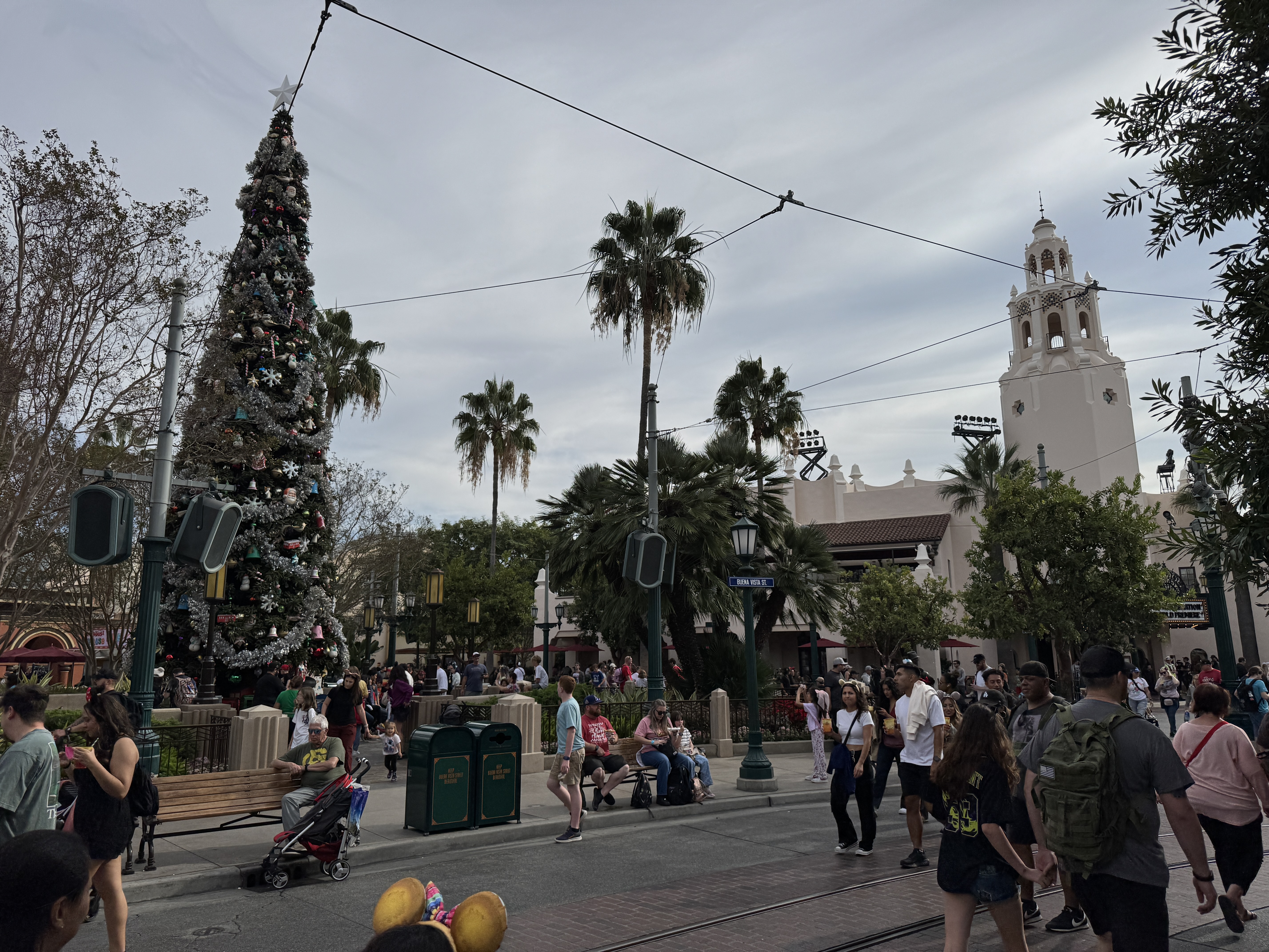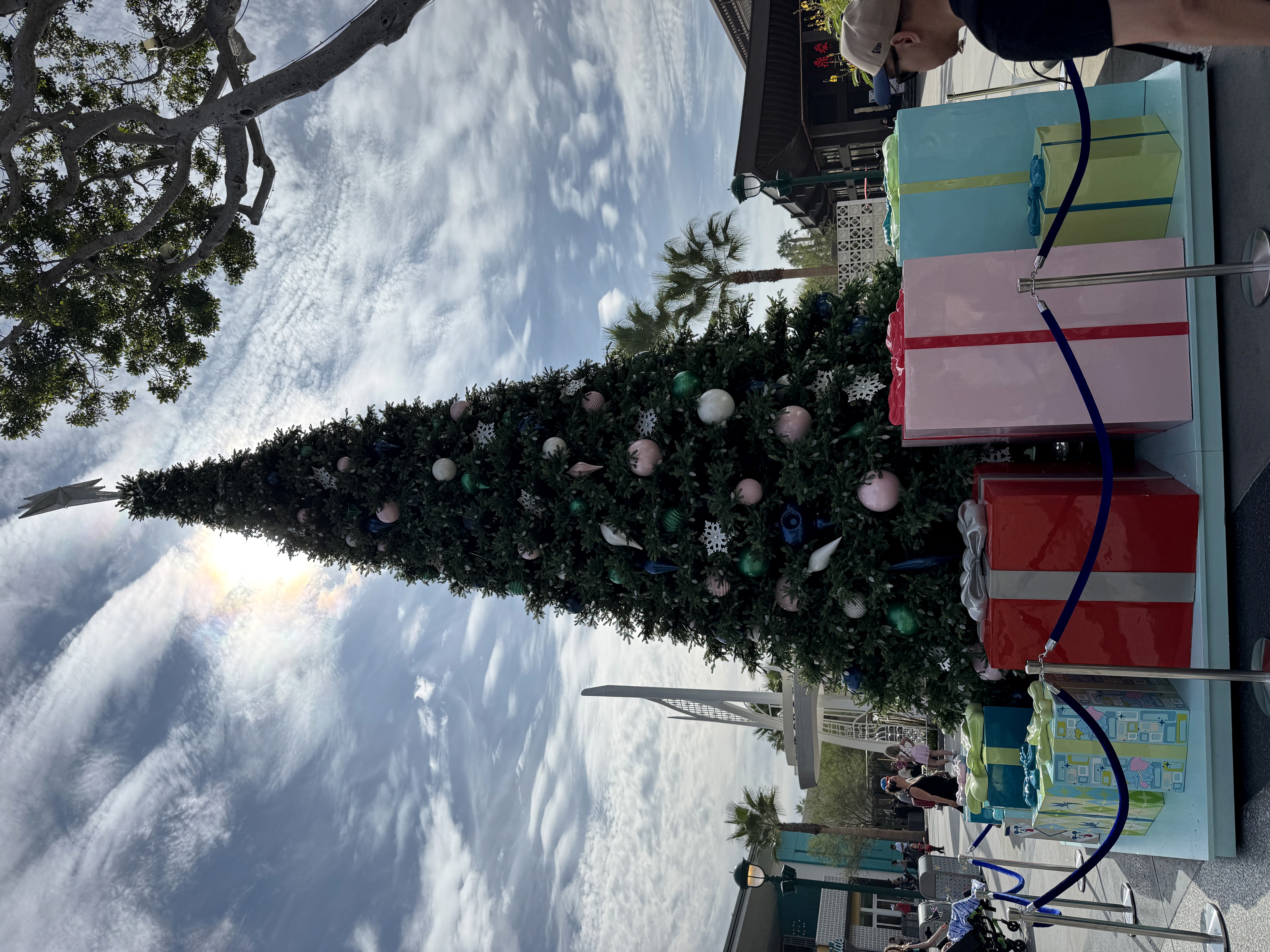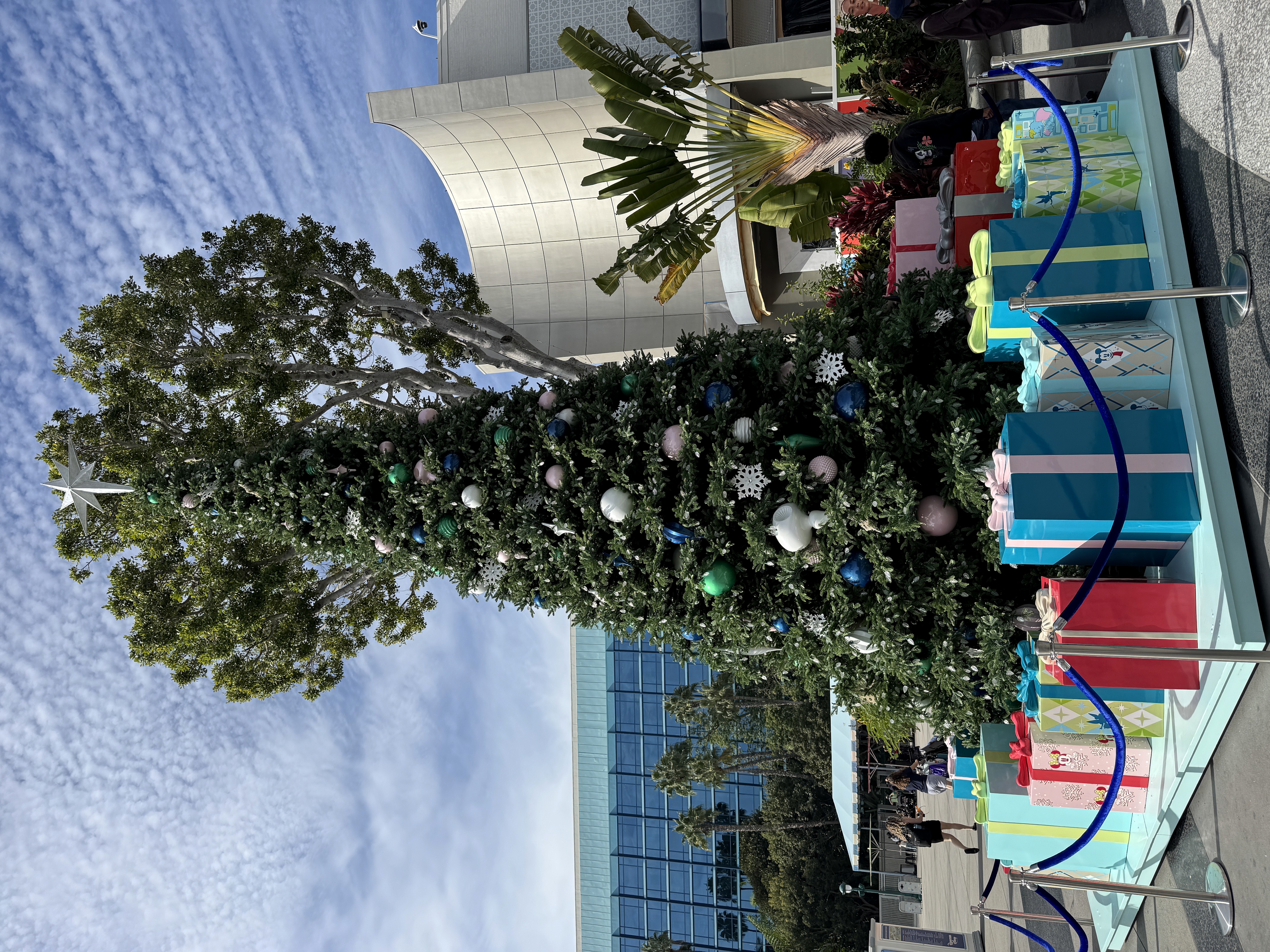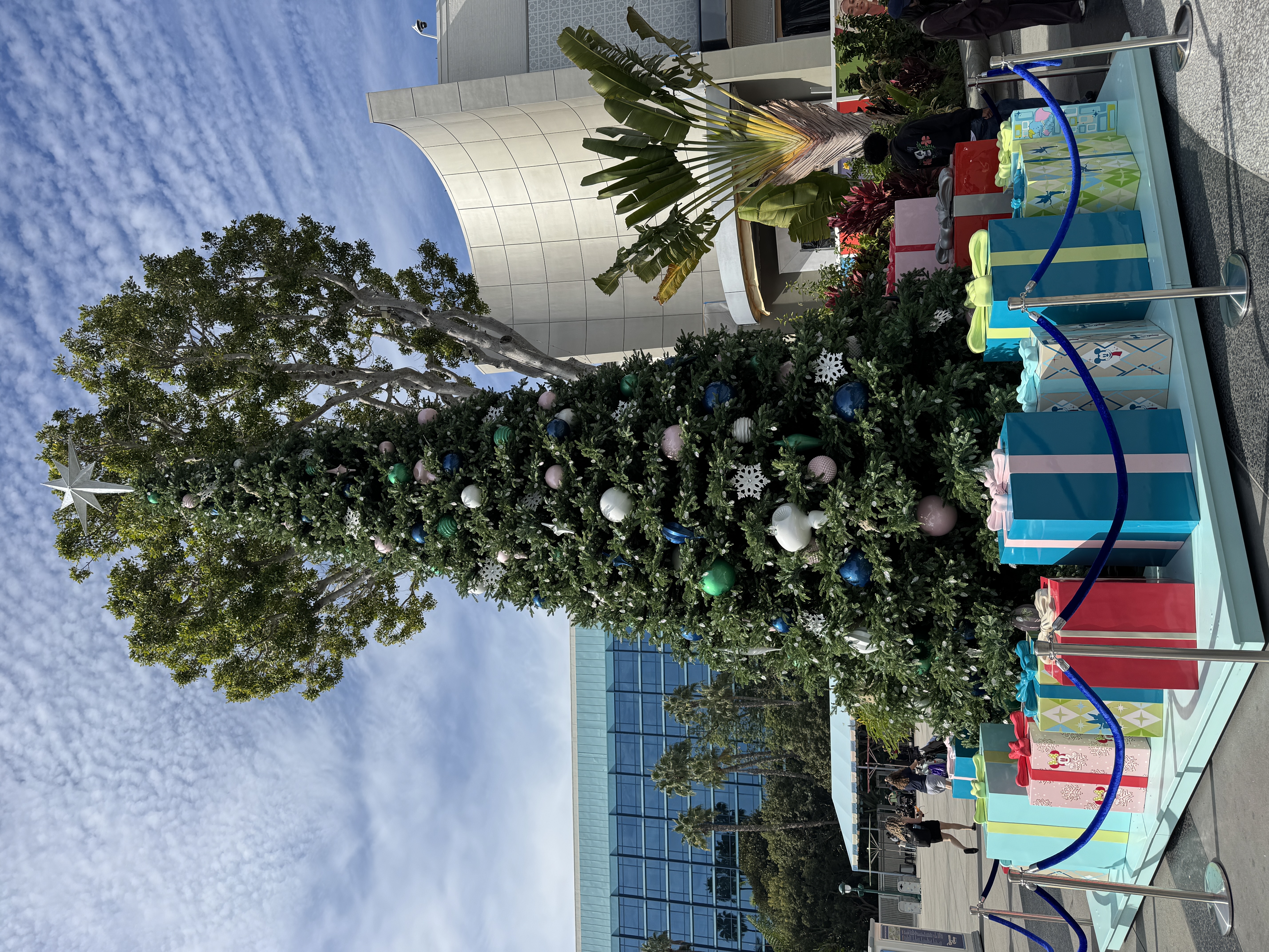 Near the Disneyland Hotel entrance to Downtown Disney, a towering Christmas tree adorned with cool-toned ornaments and sparkling snowflakes has made its debut.