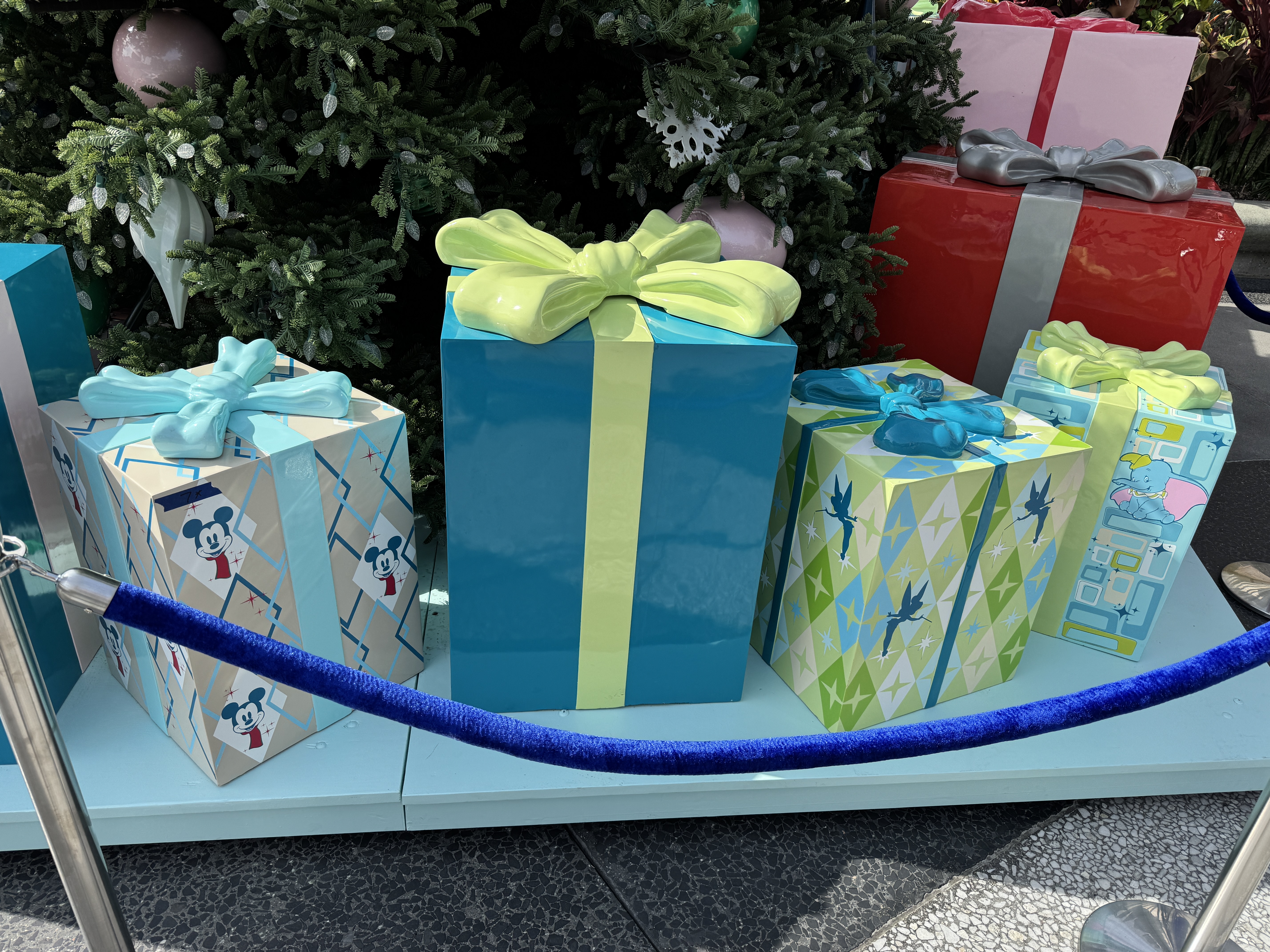 At the base of the tree, a collection of brightly wrapped presents themed to beloved Disney characters, including Mickey Mouse, Tinker Bell, and Dumbo.