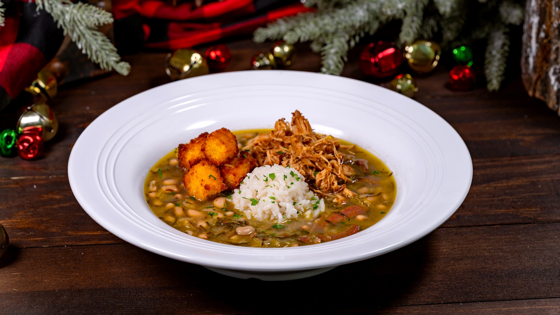 - Black Eyed Pea Stew with Chicken and Corn Bread Croutons - Available at Tiana's Palace.