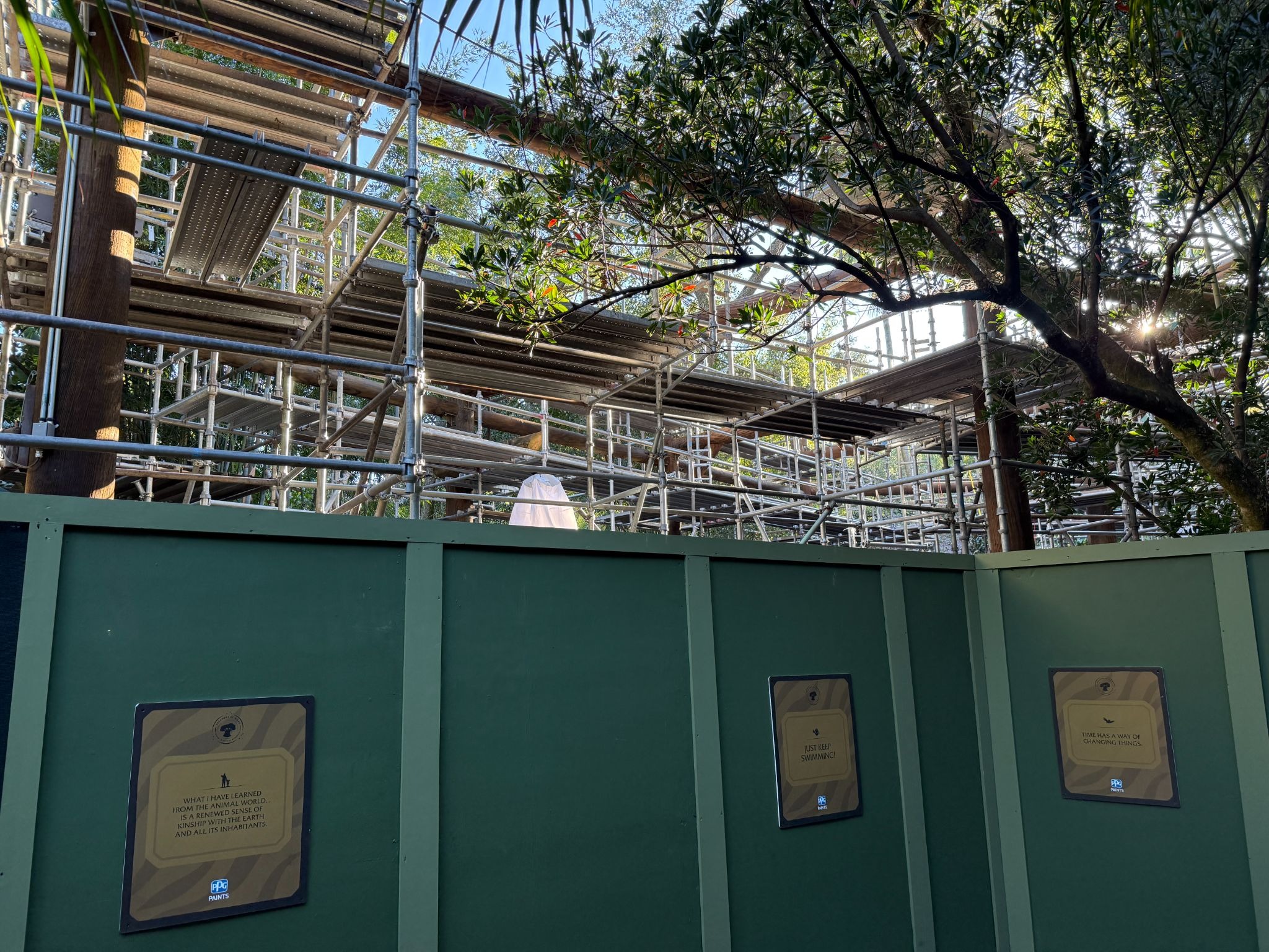 - The construction walls are decorated with quotes related to the theme park, as well as the PPG Paints logo.