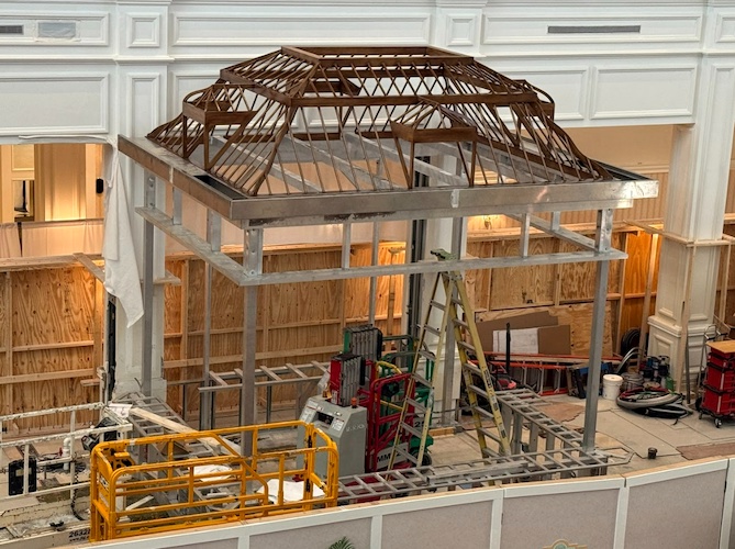 The most prominent development is the framework taking shape for a new Lobby Bar on the main floor. This new structure replaces the old iconic birdcage that was in this space