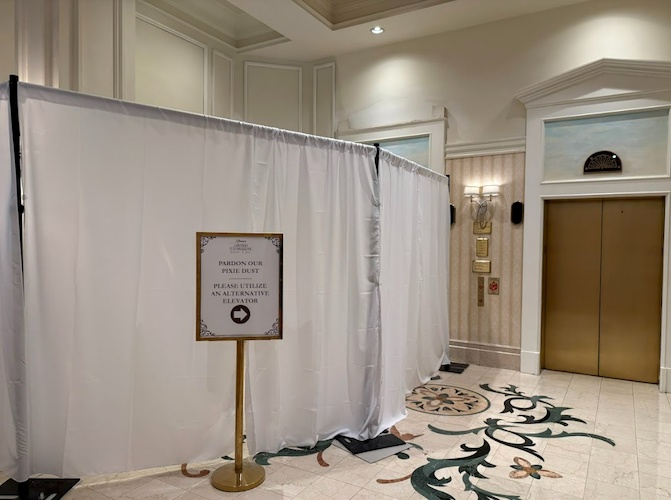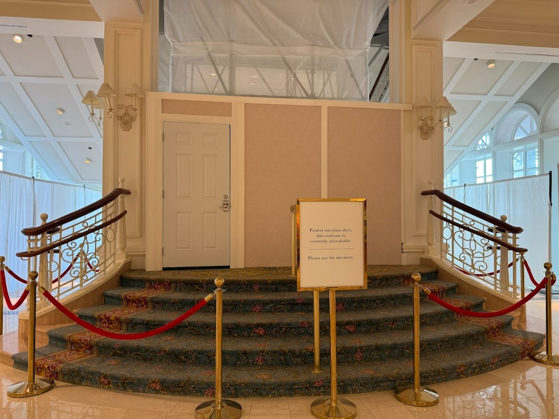 Walt Disney World’s flagship resort, Disney’s Grand Floridian Resort & Spa, is in the midst of a significant, multi-year transformation, and checked in again on its iconic grand lobby. Guests arriving at the celebrated resort are now greeted with construction walls, tarps, and signs of the pixie dust being spread to reimagine the space.