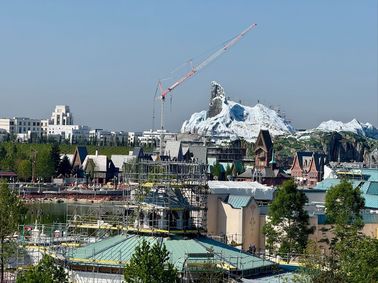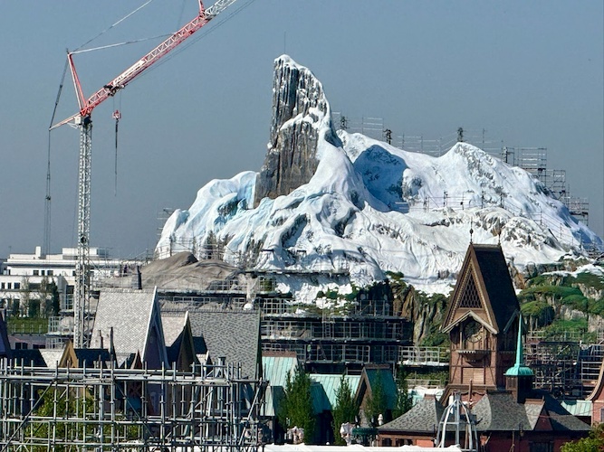 - Starting with World of Frozen, much of the external theming and rockwork have now taken shape. The large North Mountain Facade towers over the park's new lagoon, still awaiting the installation of Elsa’s Ice Palace.