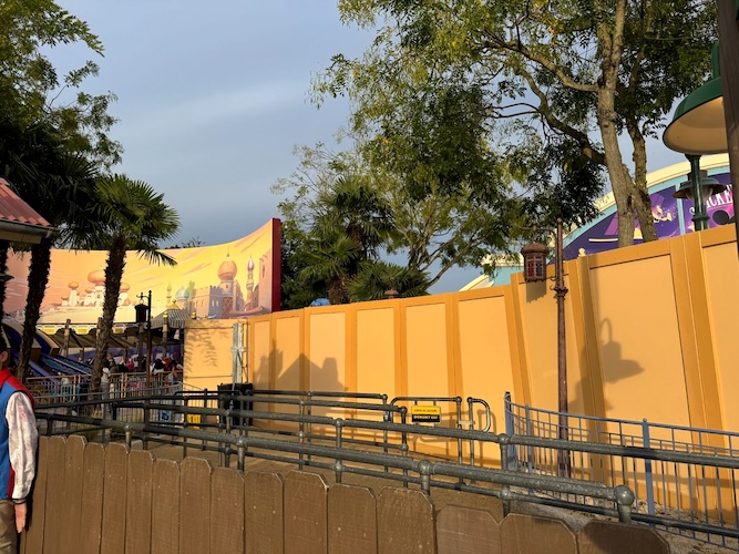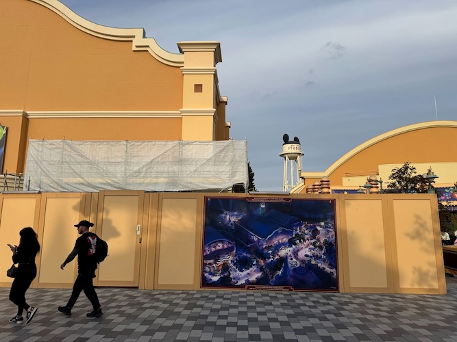 Starting at the perk entrance, walls are up around the back side of the World Premiere building. Concept artwork on the walls depicts the soon-to-be reimagined World Premiere Plaza.