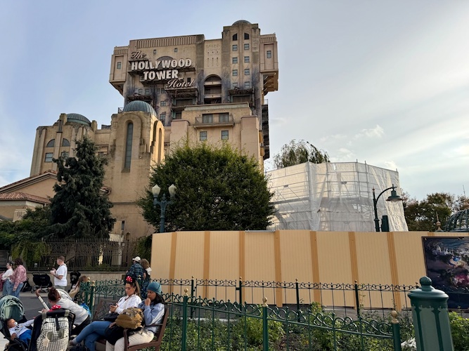 Moving along towards Tower of Terror, construction walls block off the area in front of the attraction, all the way up to the exit of the attraction.