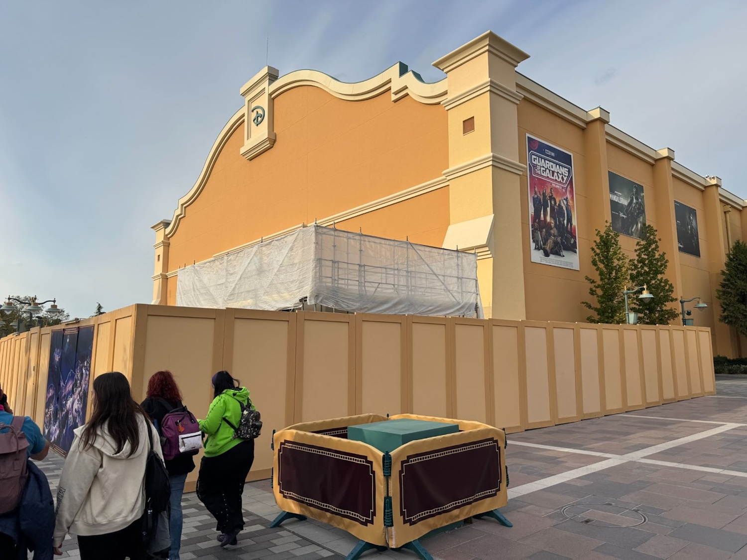 Starting at the perk entrance, walls are up around the back side of the World Premiere building. Concept artwork on the walls depicts the soon-to-be reimagined World Premiere Plaza.